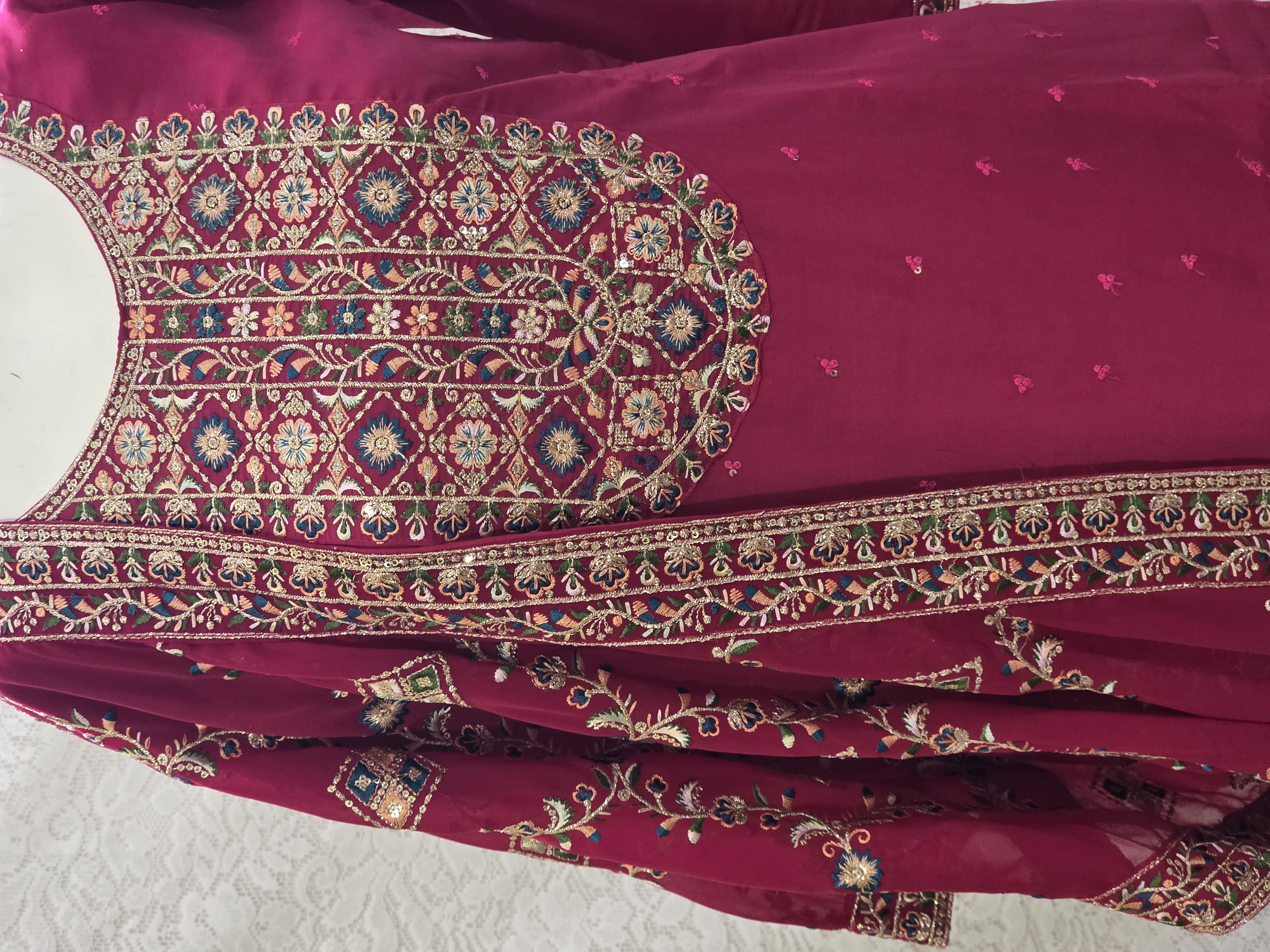 A female model elegantly showcases a deep magenta salwar kameez with intricate gold embroidery and a matching dupatta.