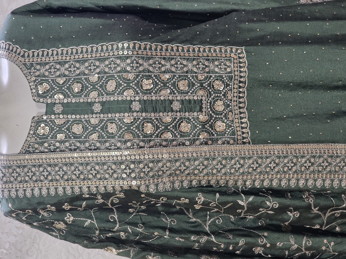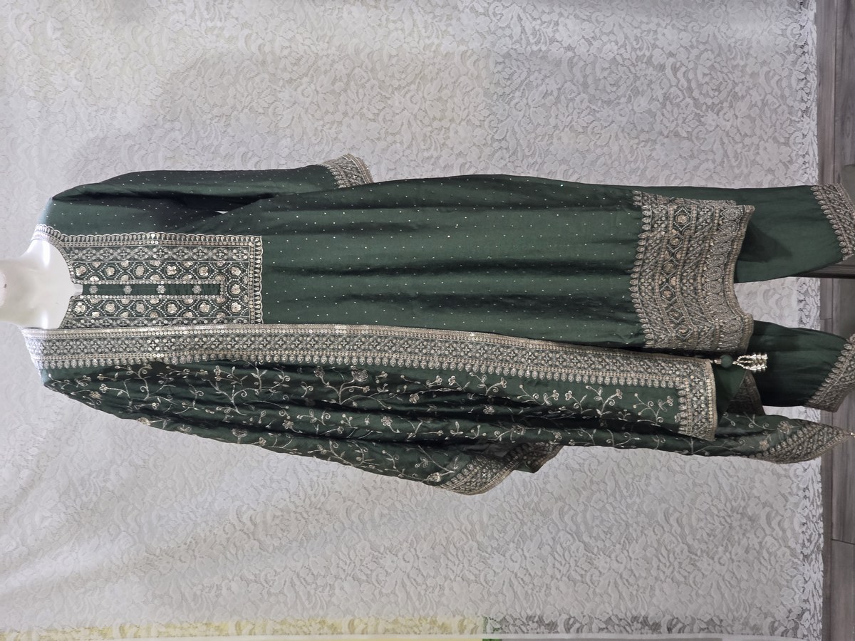 A woman is wearing an elegant mehndi green salwar kameez set featuring intricate silver embroidery and a matching floral-patterned dupatta.