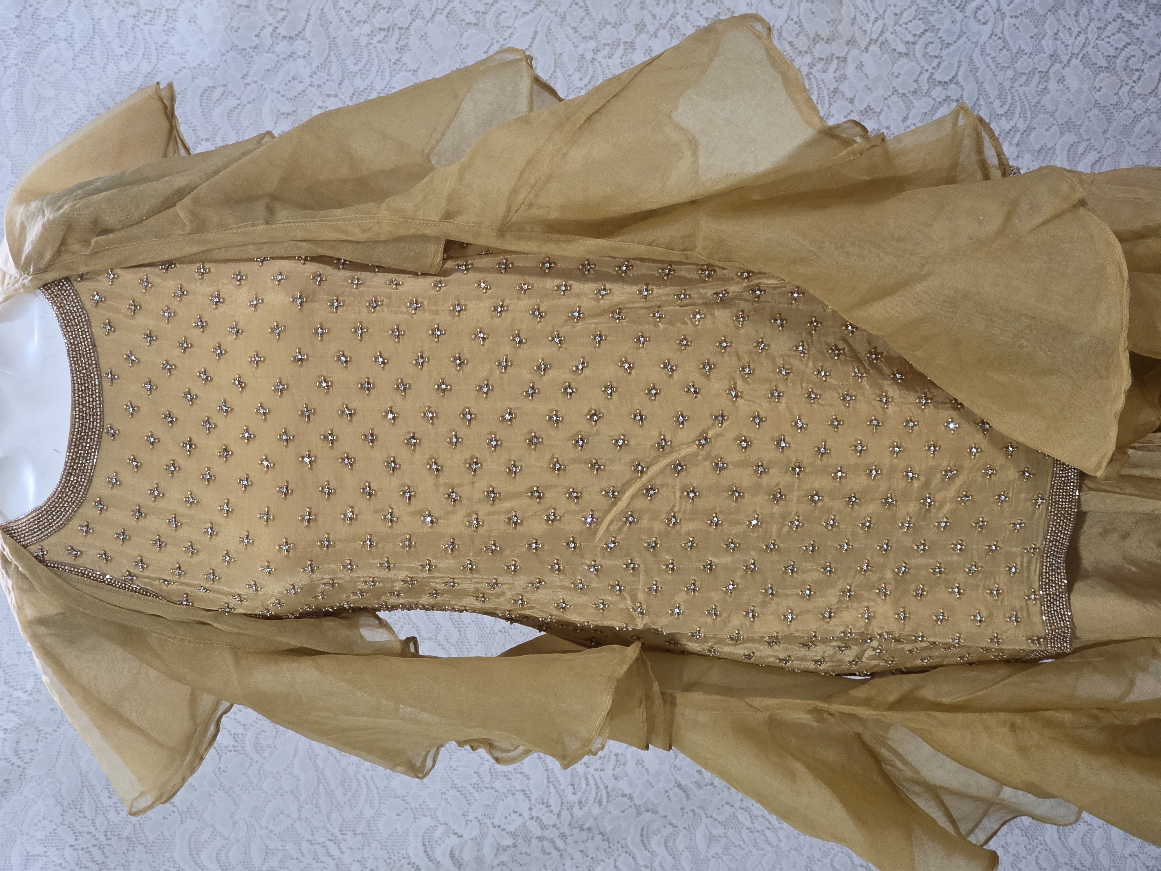 This is a gold-toned ethnic ensemble featuring a sleeveless tunic adorned with beadwork, paired with wide-leg trousers and a dramatic ruffle-edged cape.