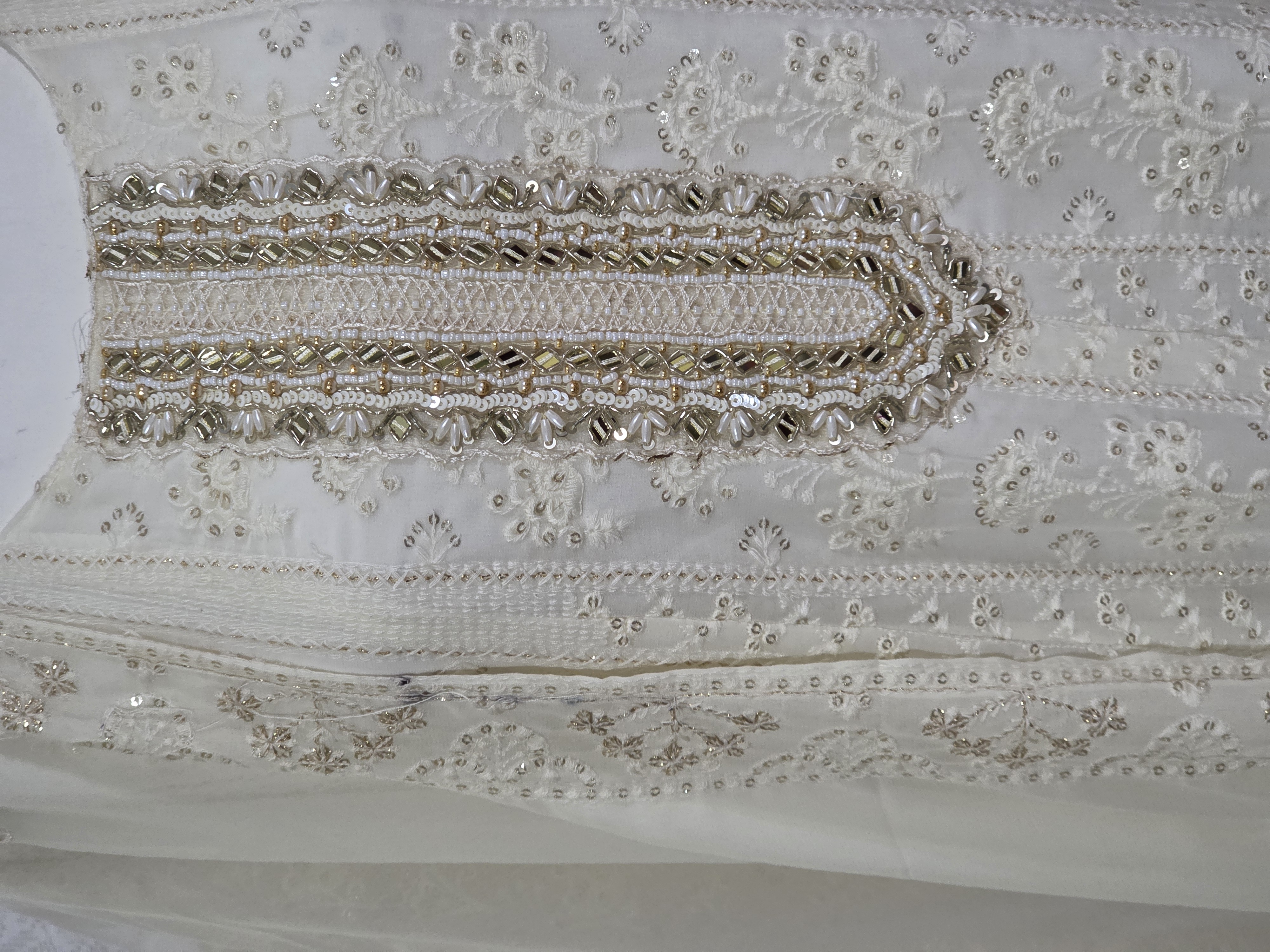 This ivory cream color Anarkali kurta set is made in gorgett fabric with thread machine lucknowi chickenkari embroidery and sequin work all over. Has wide palazzo and gorgett dupatta with work all over