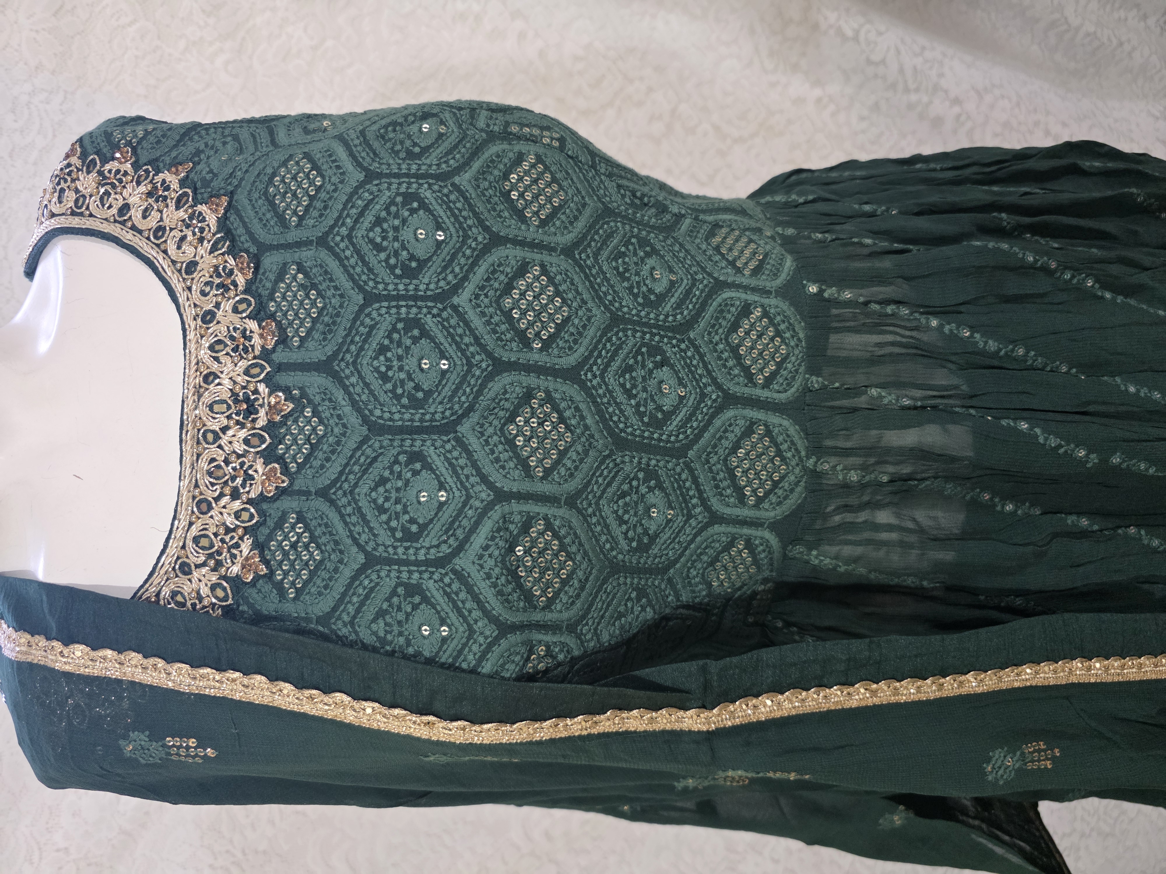 This bottle green nyra cut style top with wide palazzo and dupatta set are made in gorgett fabric. Has fine machine embroidery and sequin work done along with hand kutdana, zardosi and rhinestone work around the neck