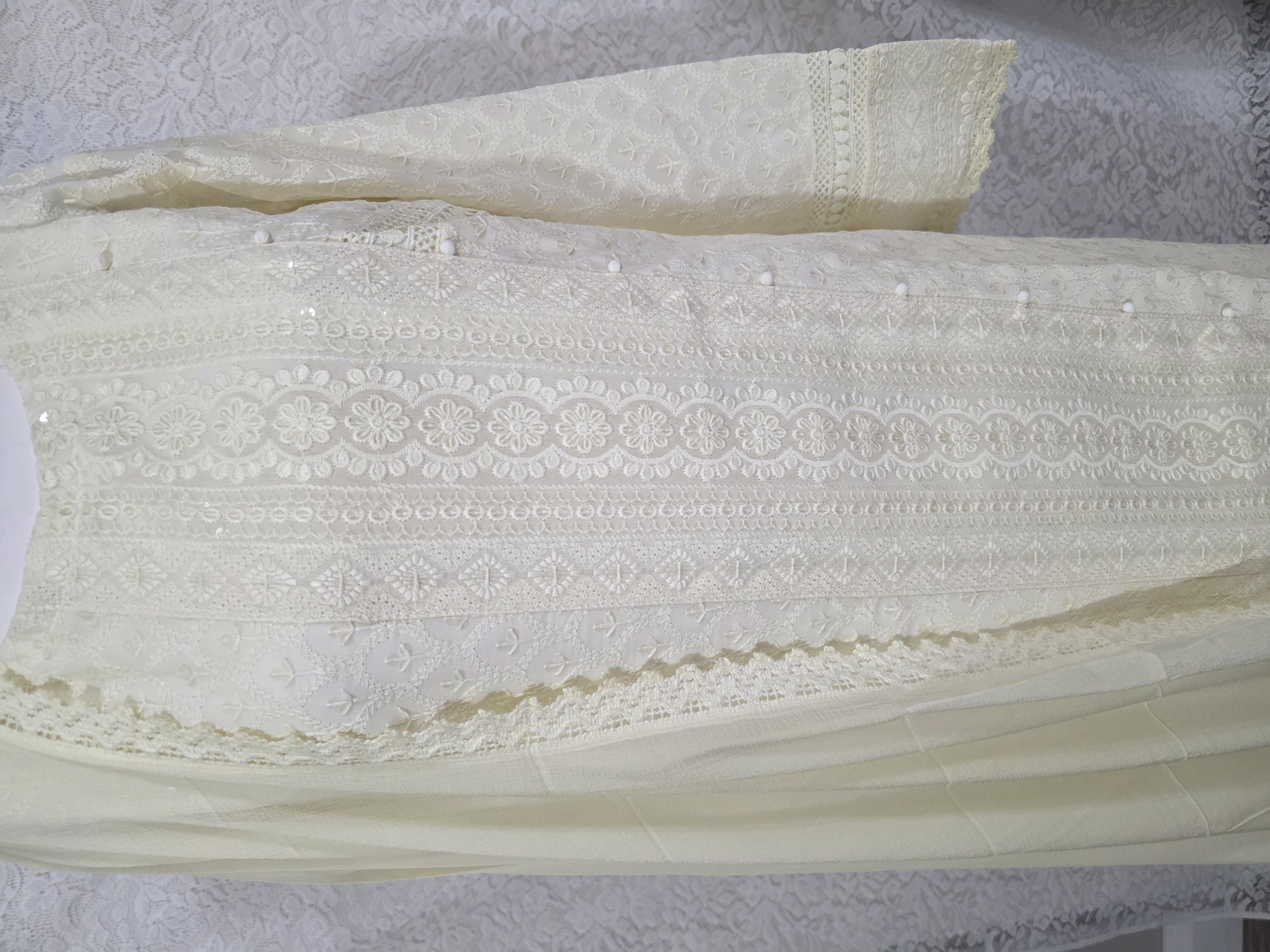 This outfit is a sophisticated pastel lemon yellow-colored Chikankari salwar kameez set, featuring intricate self color floral embroidery and paired with a matching lace-edged dupatta