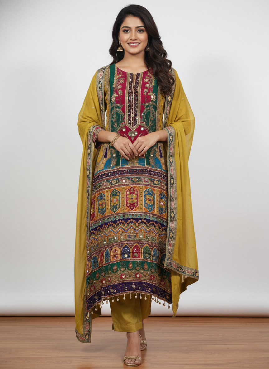 This elegant sage green ensemble features a high-neck cropped bodice with intricate silver floral embroidery and bead-fringe detailing, paired with a matching flowing floor-length skirt and an attached cape-style dupatta.