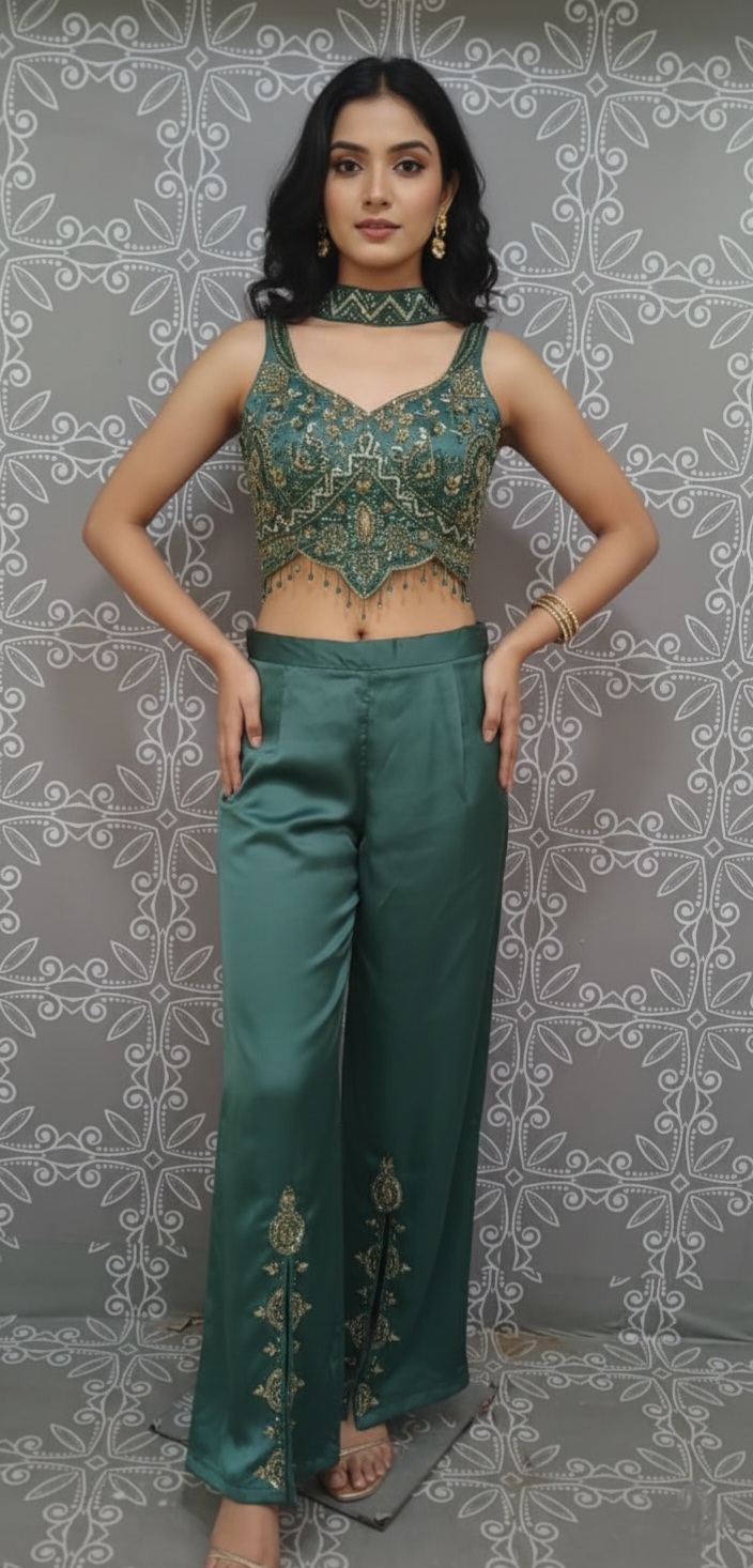 This stylish ensemble features a heavily embellished crop top with a scalloped hem and matching choker, paired with wide-leg satin trousers that showcase intricate embroidery along front slits.