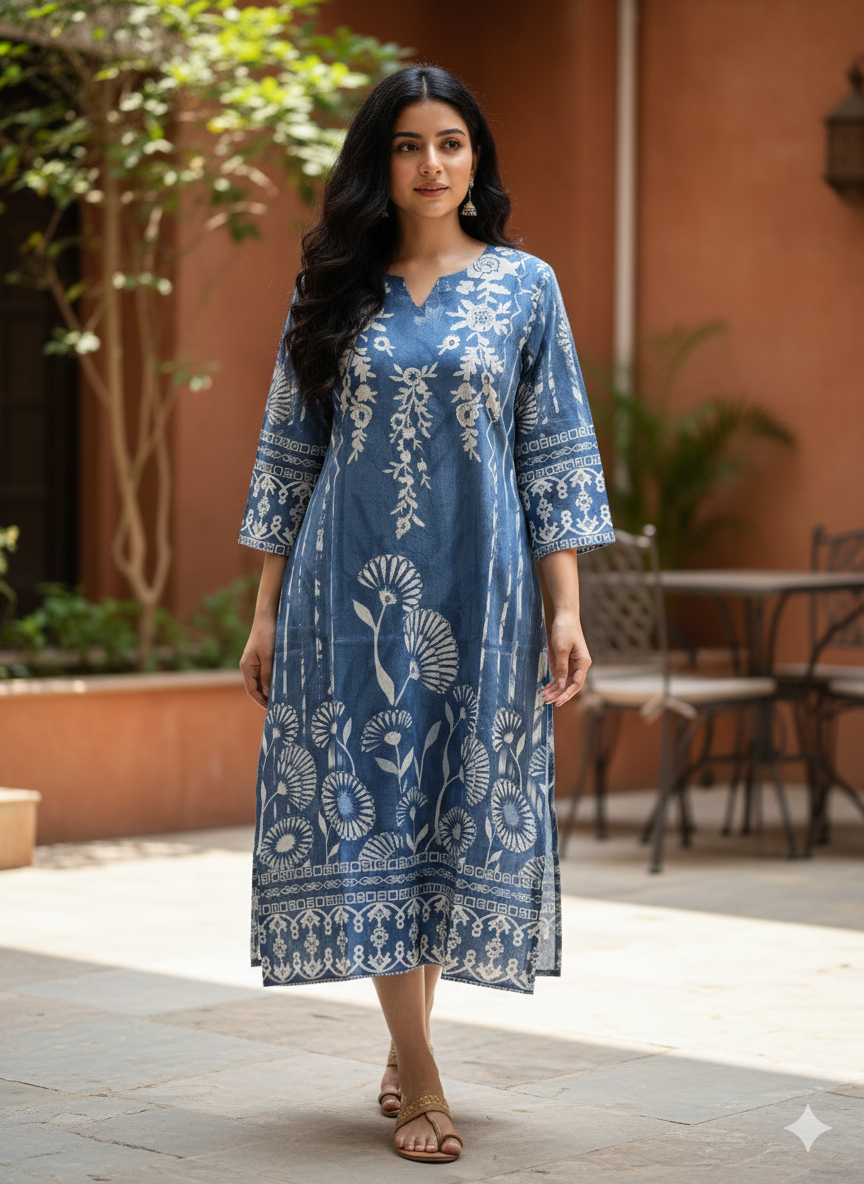 This is a classic and elegant Lehenga Choli set in a deep Prussian . The Choli is a sleeveless, cropped bodice with thin spaghetti straps, heavily embellished with intricate Zari work and sequins. * Hemline: It features a slightly scalloped or decorative bottom edge, sitting just above the waist. The Lehen skirt is adorned with large floral gold weaving silk that transition from the mid-section down to the hem. * Border: The base of the lehenga features a thick, structured border with geometric and traditional patterns, giving the skirt weight and a polished finish. The Dupatta (Scarf) * Material: A matching blue fabric, likely georgette or silk blend. * Embellishment: It features a tilla or lace border in a muted gold/silver tone. Small "butti" (floral dots) are scattered across the body of the fabric, and it is finished with decorative tassels at the corners.