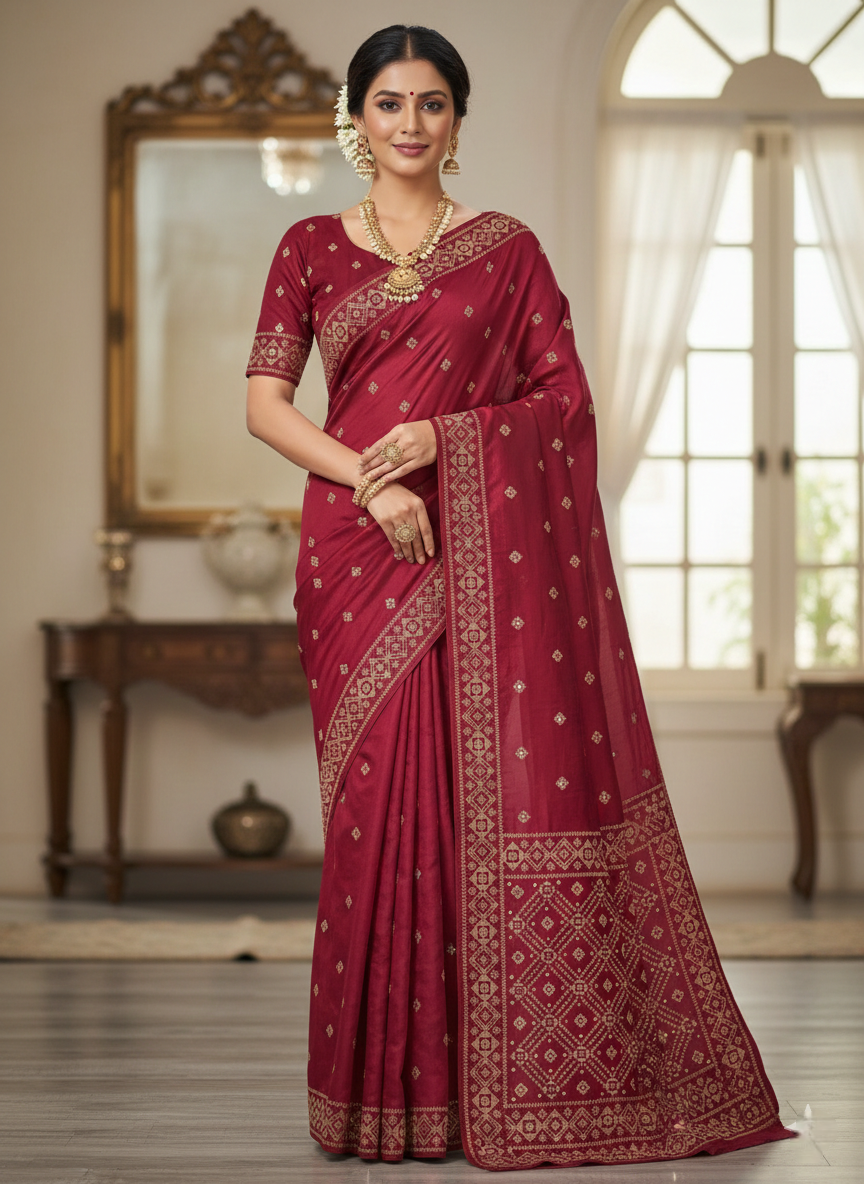 This traditional maroon lehenga choli set features a heavily embroidered sleeveless blouse paired with a matching flared skirt adorned with delicate gold motifs and a broad border. A coordinating dupatta with intricate gold embroidery and tassel details completes the ensemble, making it an ideal choice for weddings or festive celebrations.