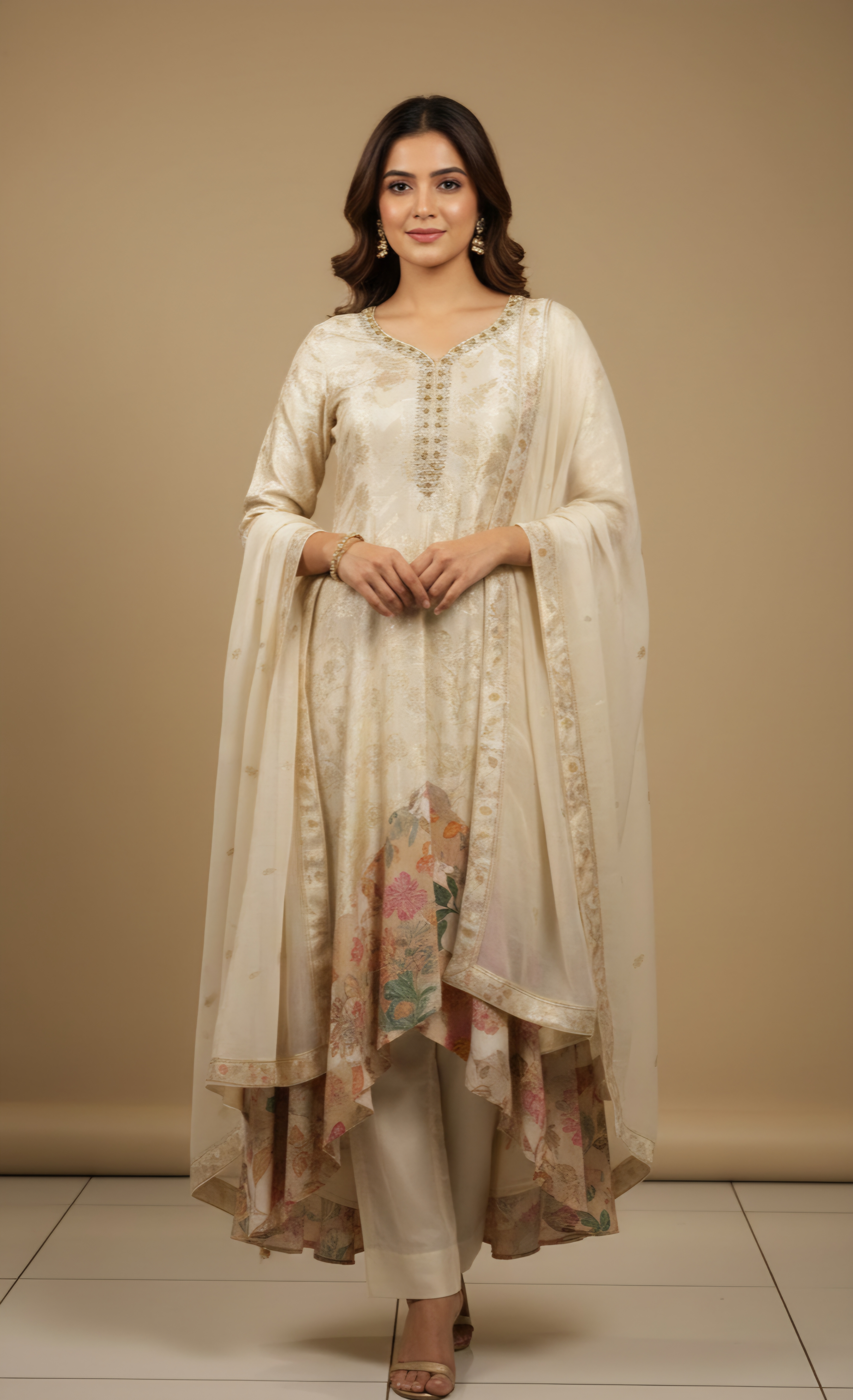 This striking Anarkali-style suit features an asymmetrical high-low hemline adorned with a bold, colorful floral print and delicate gold sequin work. The outfit is elegantly paired with a matching dupatta with an embroidered border and coordinated trousers, creating a graceful and modern festive look.