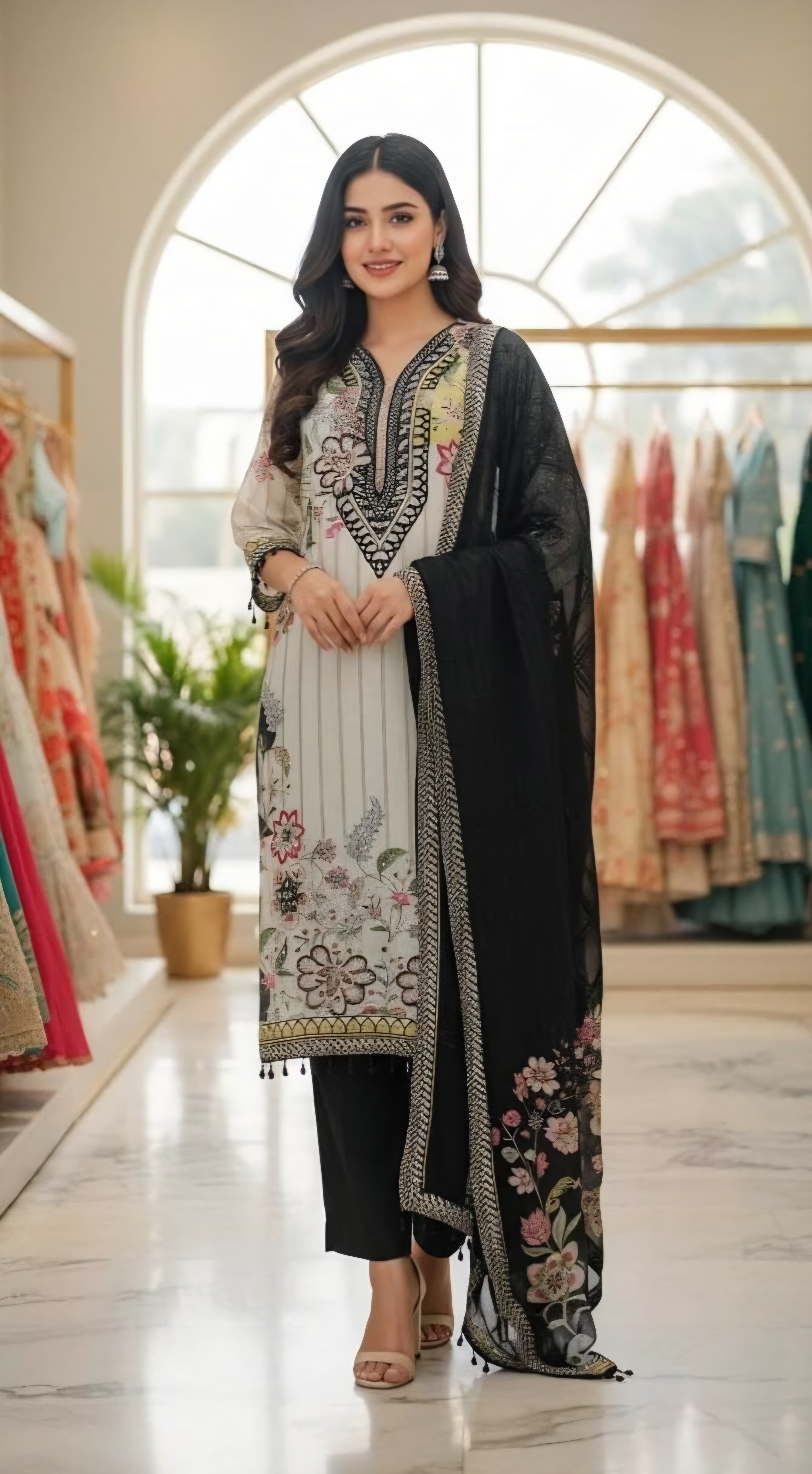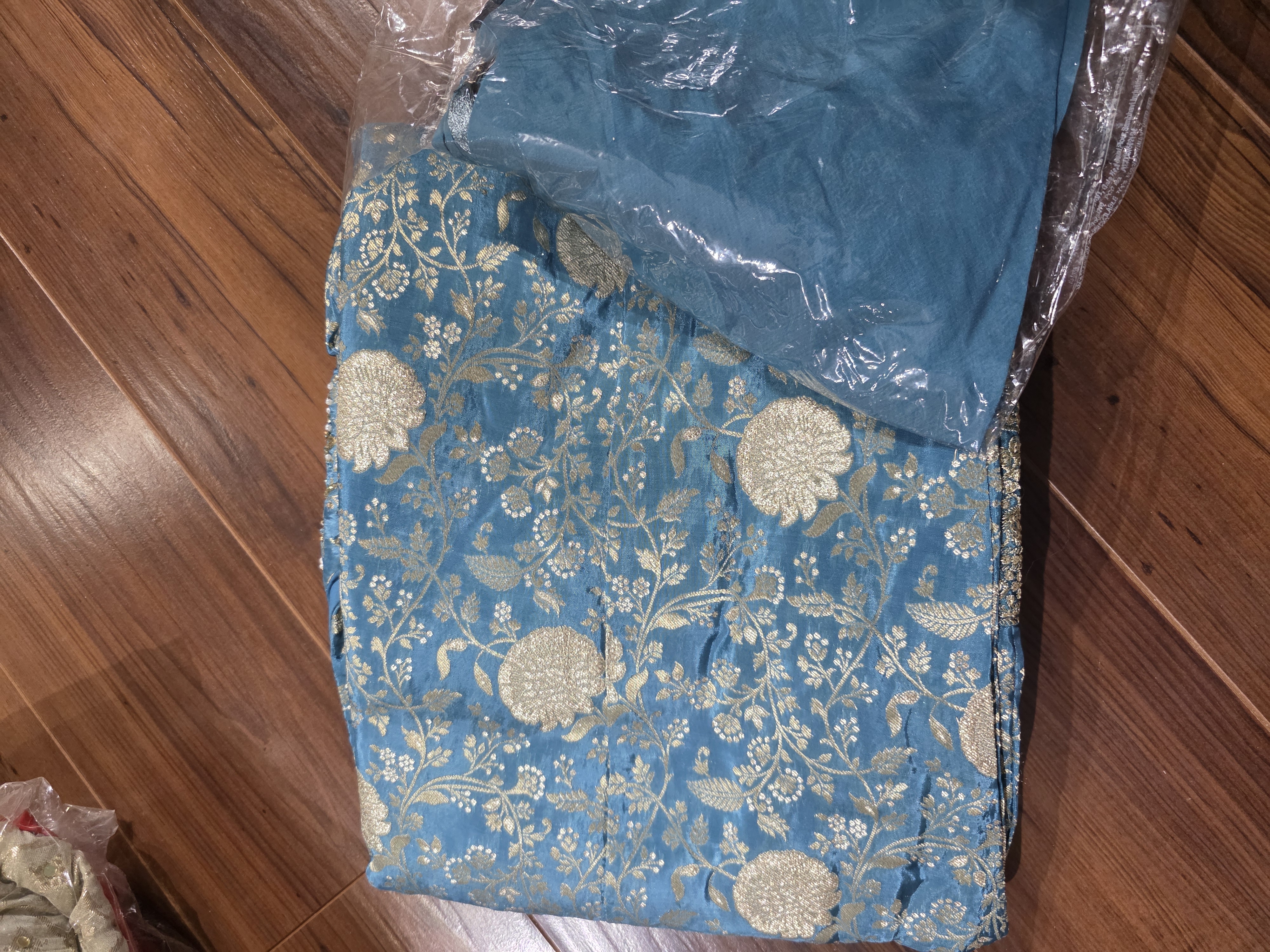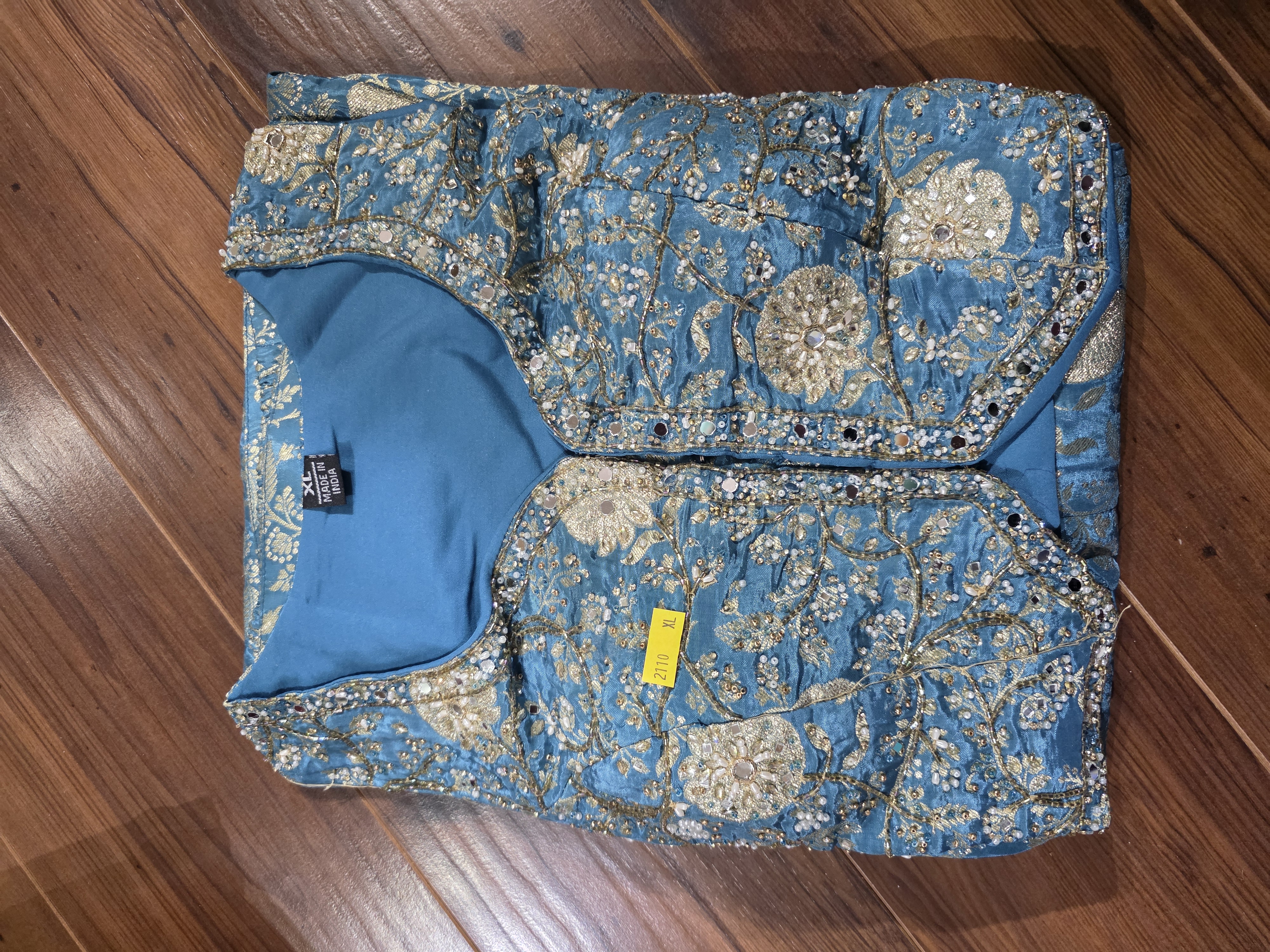This stylish Indo-western co-ord set features a heavily embellished, cropped sleeveless jacket layered over a matching bodice. The ensemble is paired with high-waisted, wide-leg palazzos adorned with delicate circular motifs and an intricate embroidered border at the hem.