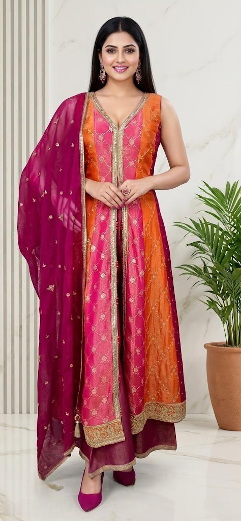 Champagne Embroidered Suit: A regal champagne-colored silk ensemble featuring intricate silver threadwork and floral motifs on the kurta and matching trousers.