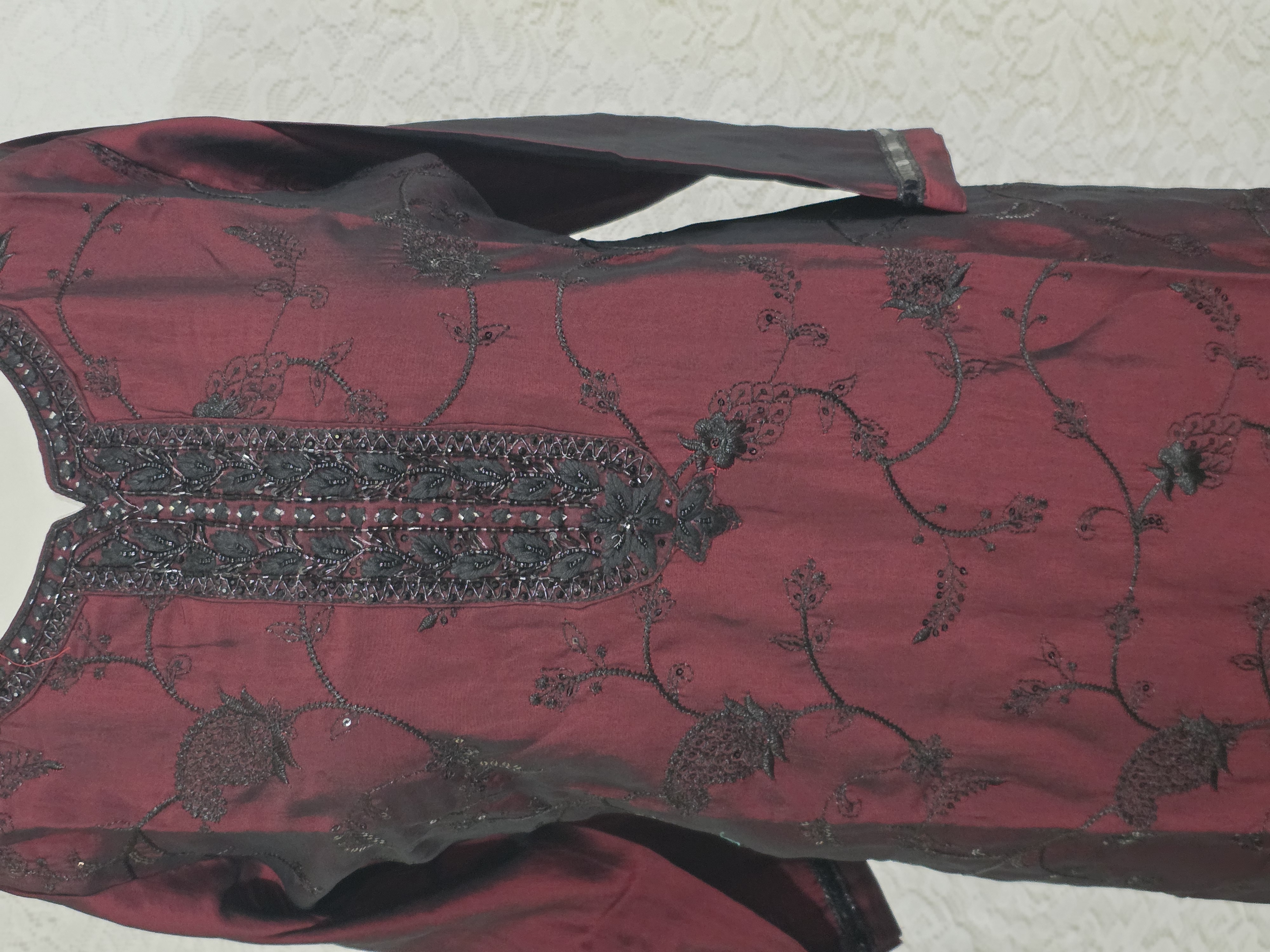 This is a sophisticated maroon salwar suit featuring a long-sleeved kurti with intricate black floral embroidery and sequin work, paired with matching straight-cut trousers and a lightweight dupatta.