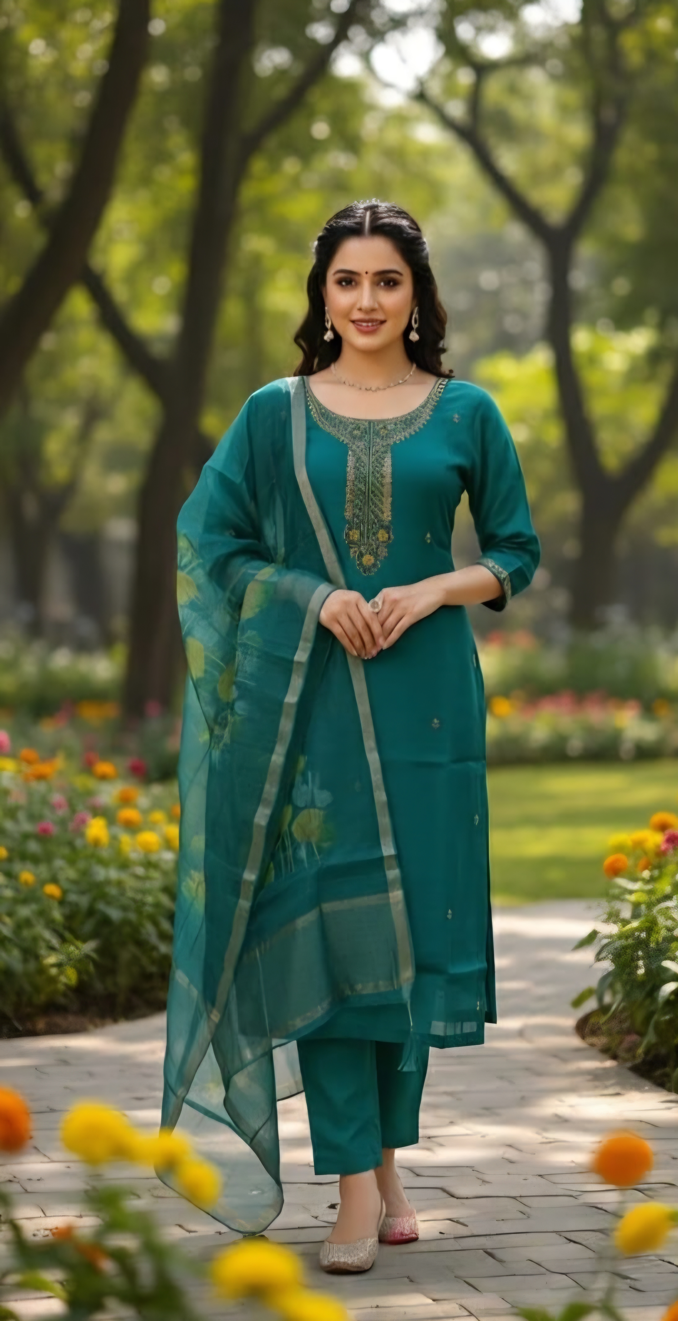 This is a magenta pink salwar suit featuring an embroidered V-neckline, paired with matching straight-cut trousers and a contrasting light pink floral-print organza dupatta with gold borders.