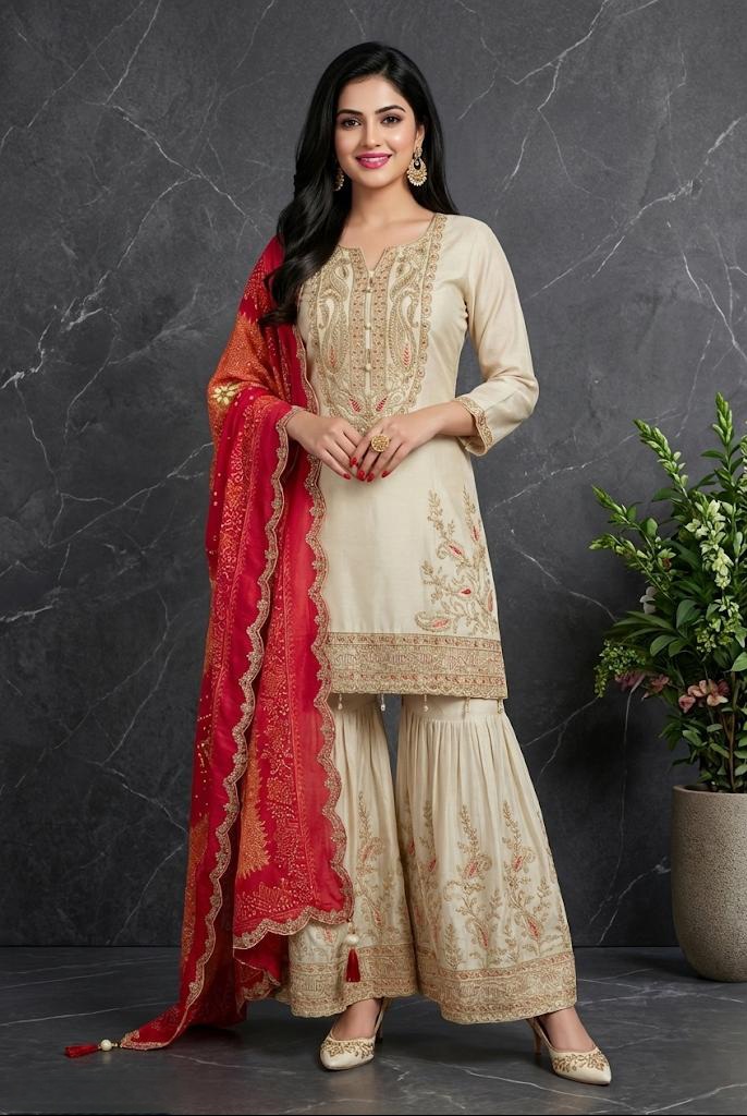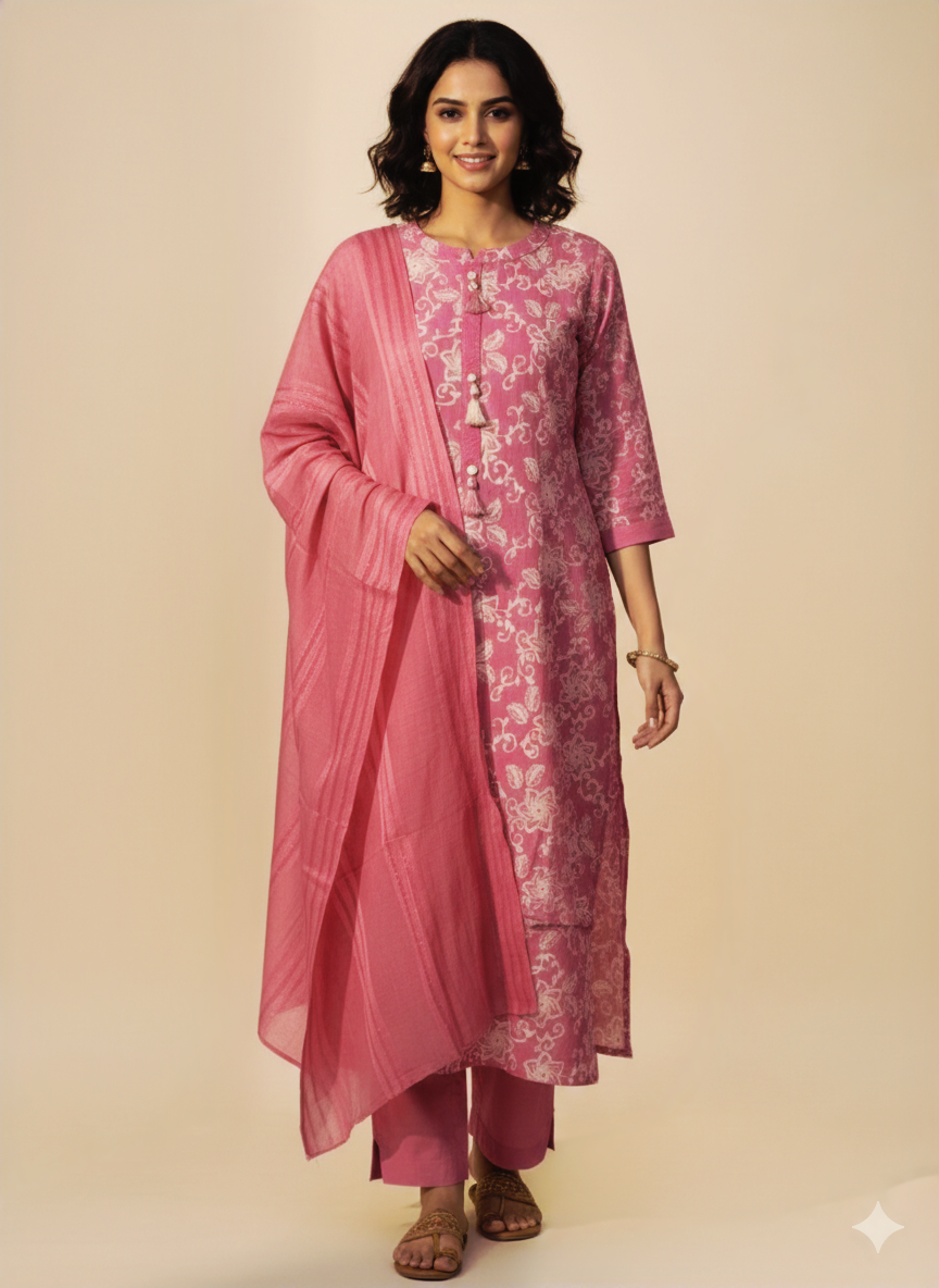 This outfit is a floral-print cotton kurta set featuring a button-down neckline with tassel details, paired with matching straight-fit trousers and a sheer striped dupatta.