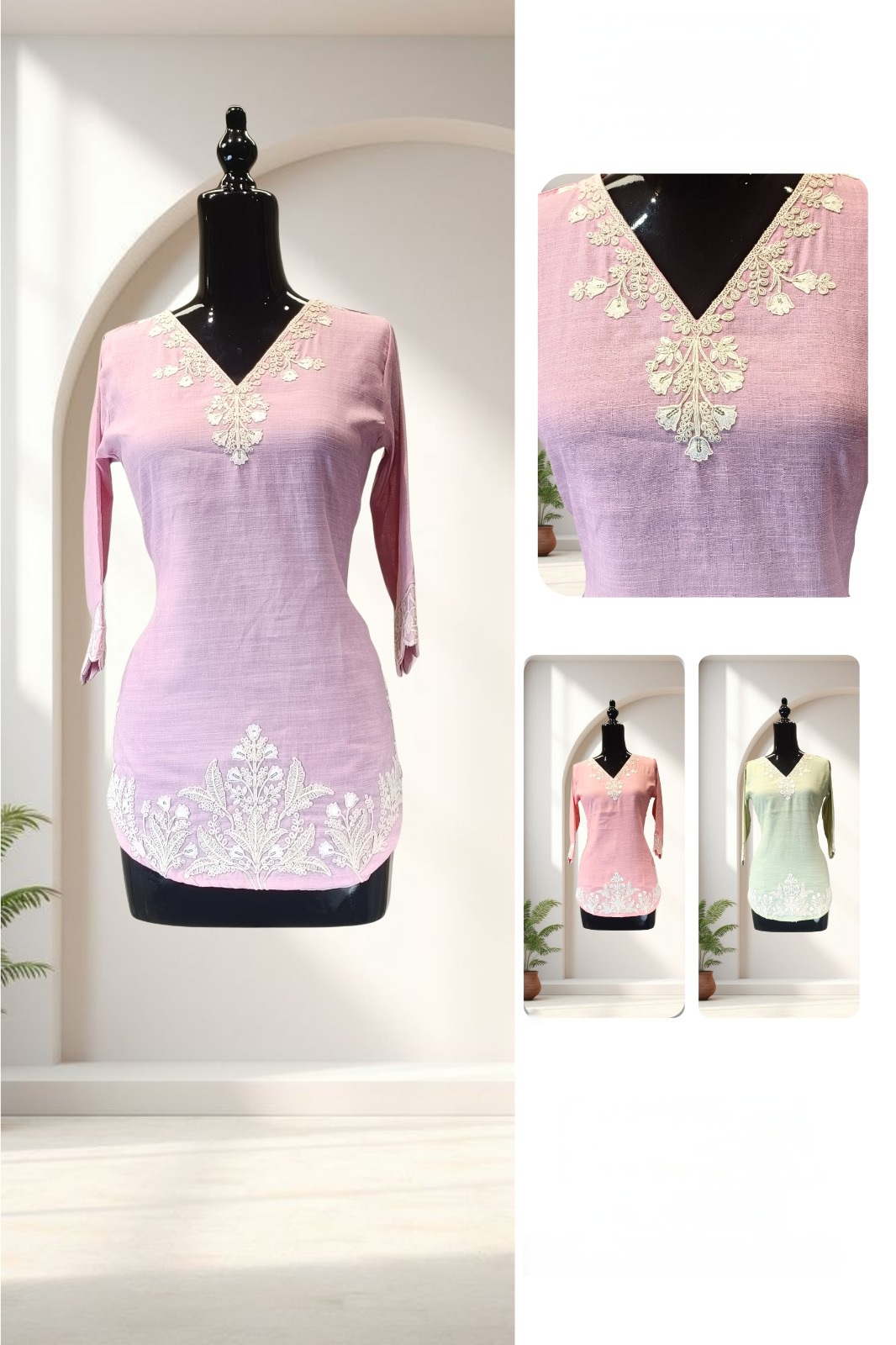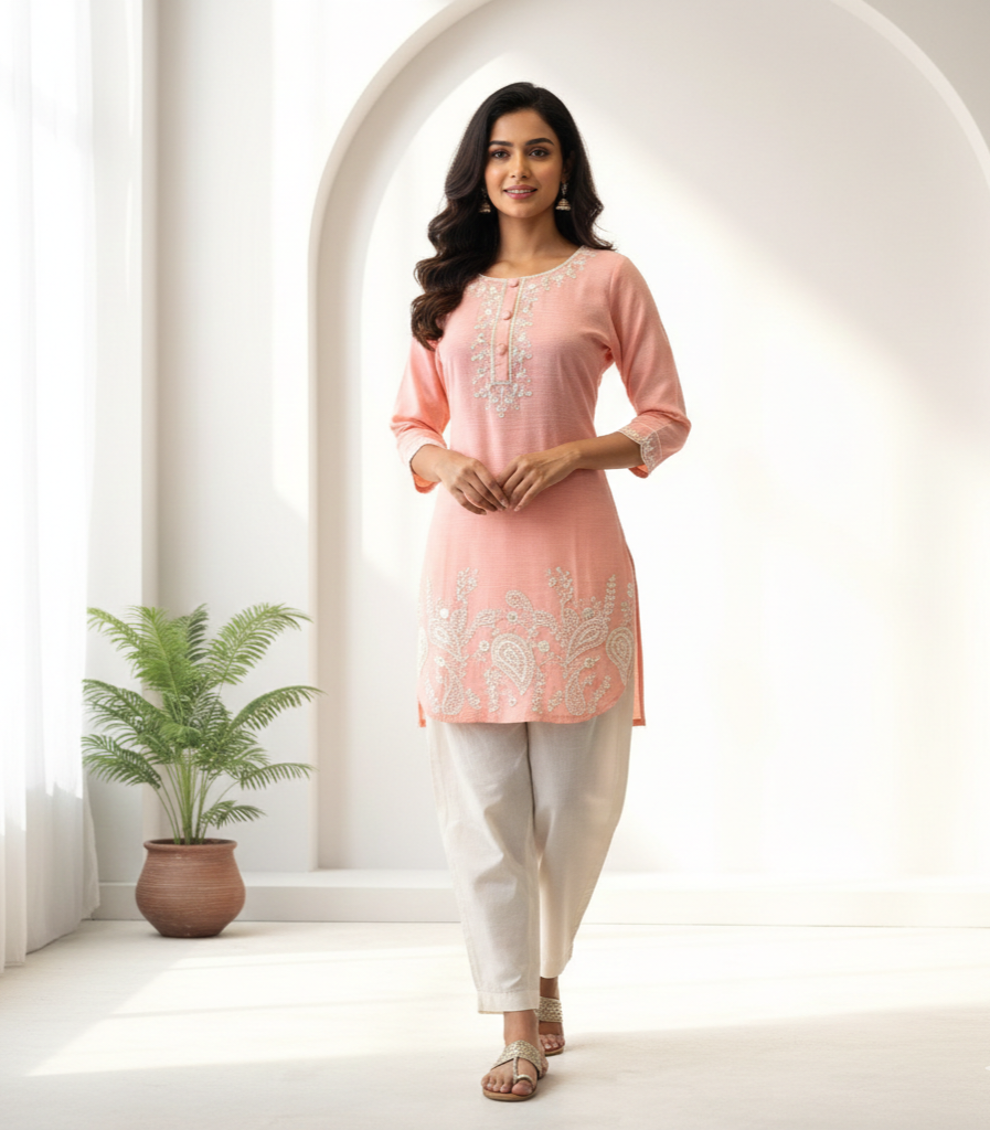 A graceful peach short length kurti adorned with delicate white embroidery on the neckline and hem,