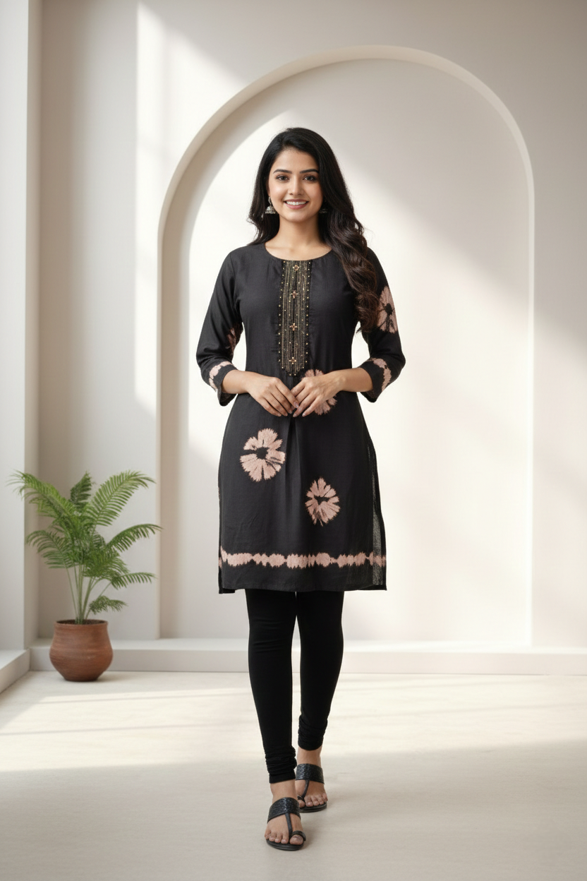 A short, dark tunic featuring a beaded placket, floral tie-dye motifs, and a patterned border made in gajji silk