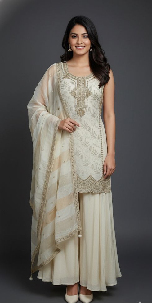 This stylish lime green short kurta features a vibrant pink geometric and floral print, a classic round neckline with a buttoned placket, and three-quarter sleeves.