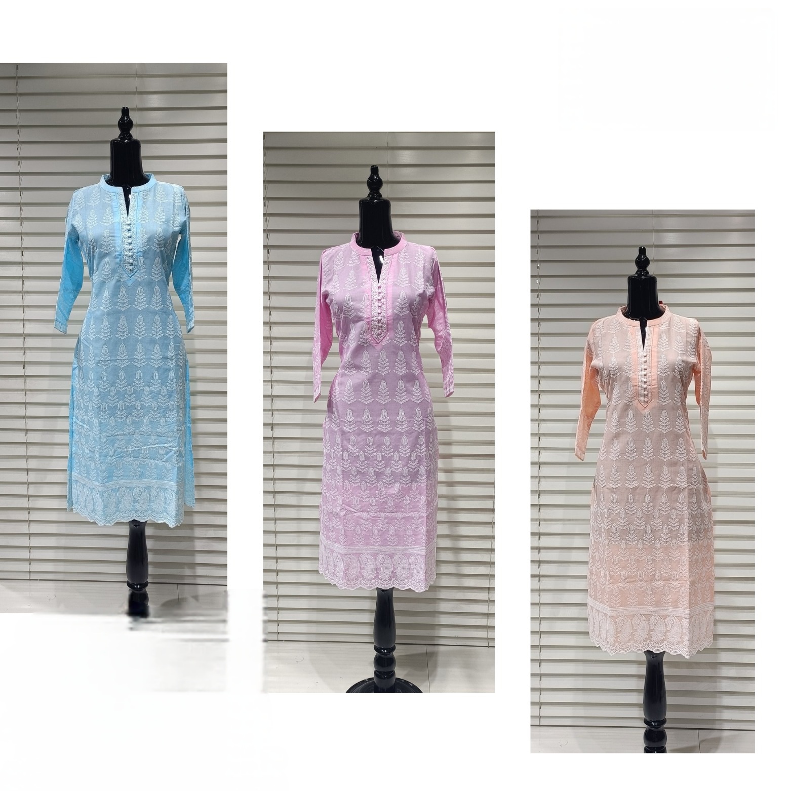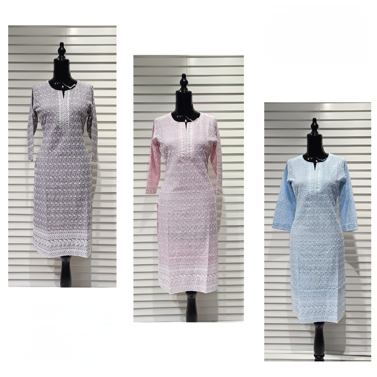Pastel Chikankari Kurta Collection: Elegant, knee-length kurtas in pastel shades of grey, pink, and blue, featuring all-over white Chikankari-style floral embroidery and a detailed border at the hem.