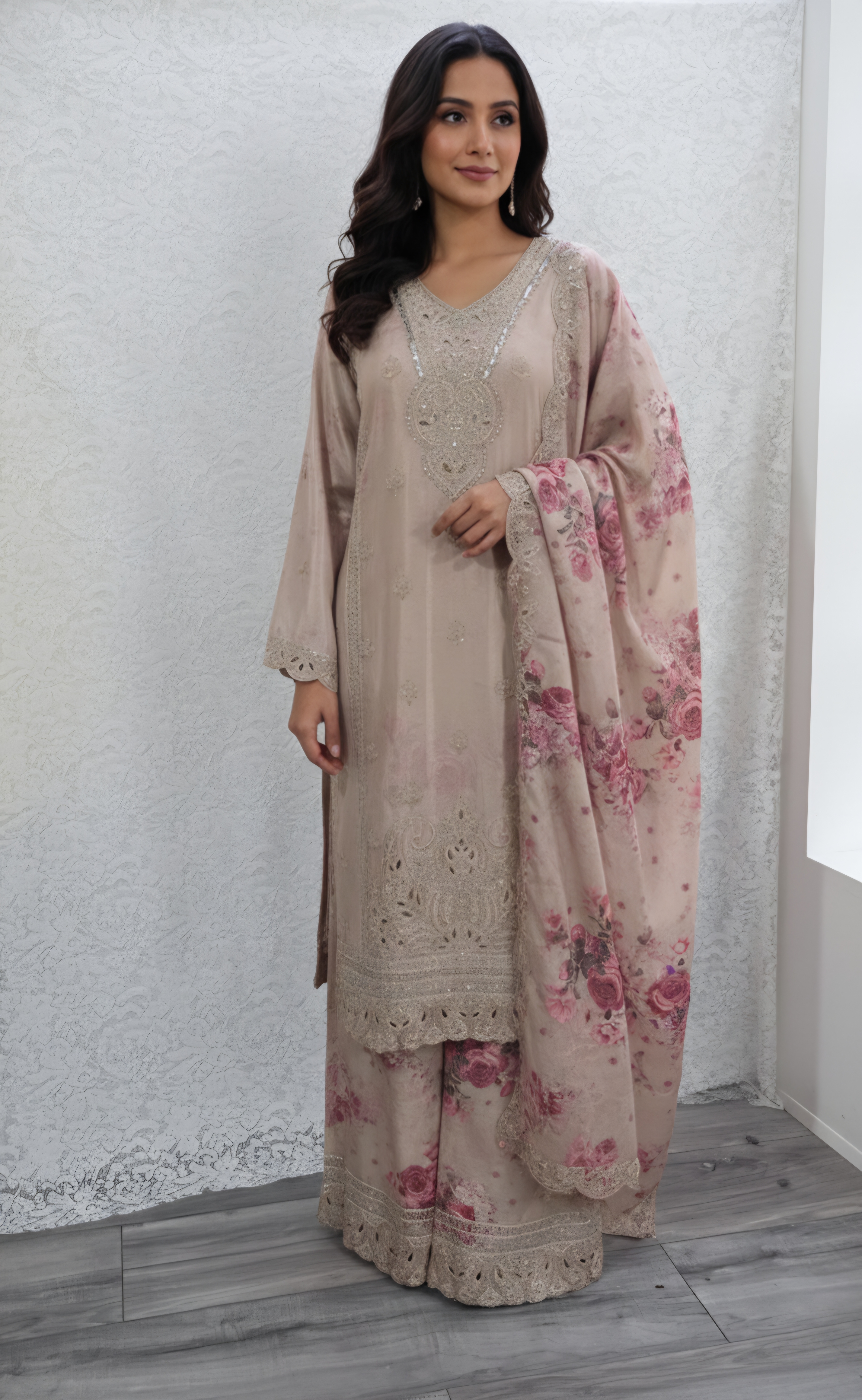 This vibrant light pink cotton kurta features an elegant floral block print and a detailed buttoned yoke,