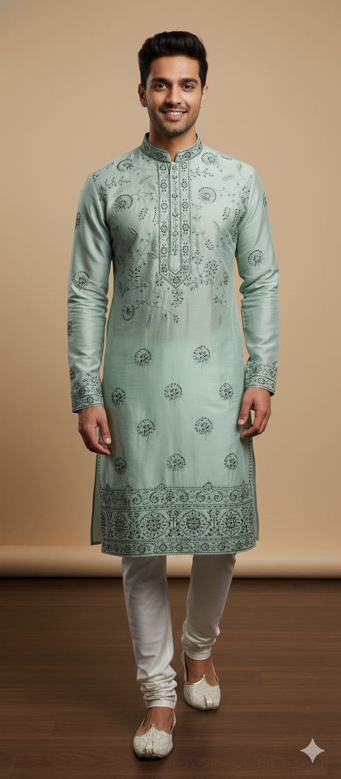 A mint green and cream silk kurta featuring intricate embroidery on the chest, cuffs, and hem, paired with white churidar pants