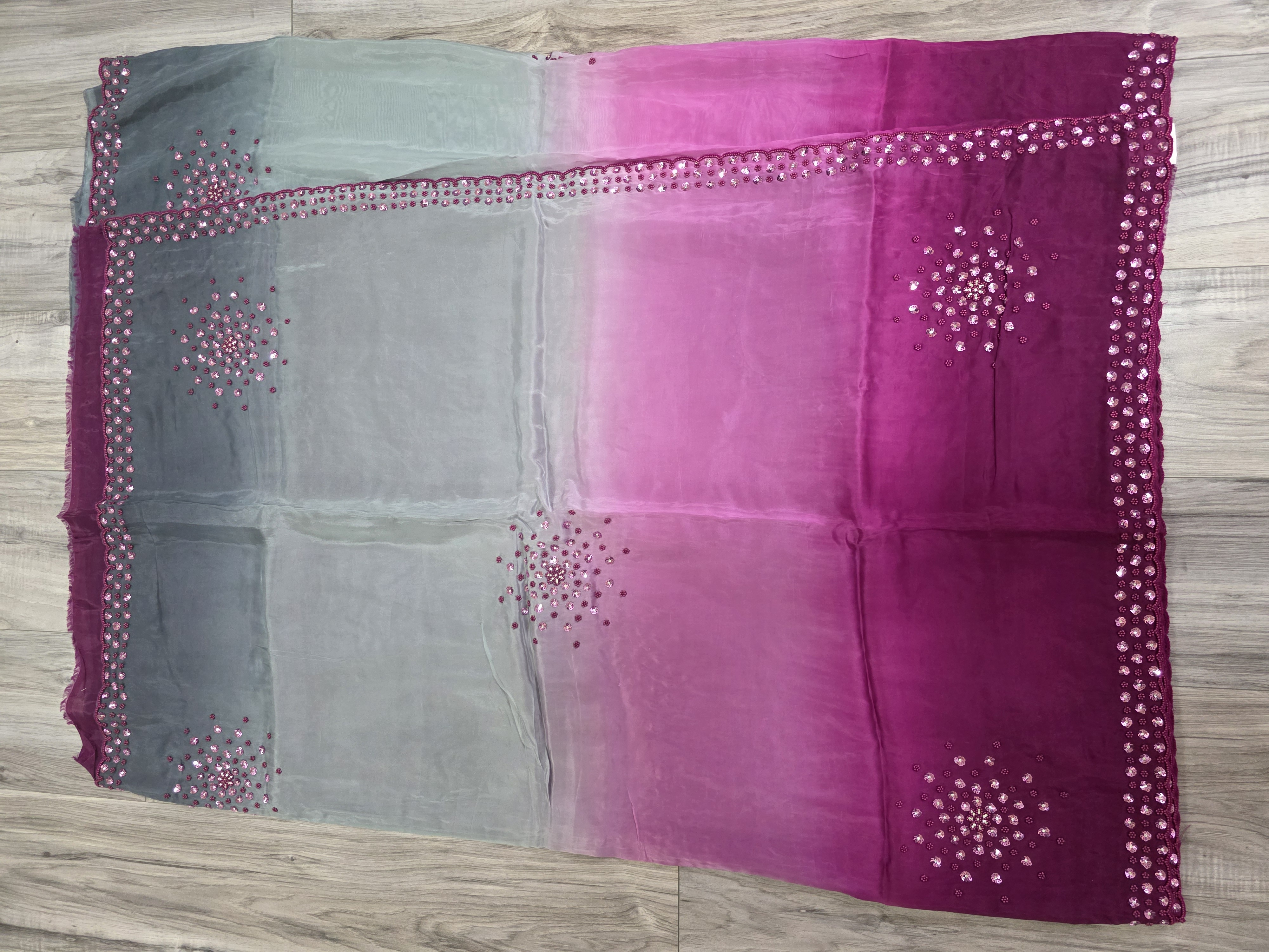 An elegant dual-toned grey and magenta georgette sari featuring delicate floral sequin embroidery and a matching blouse, styled for a classic festive look. Fabric...organza