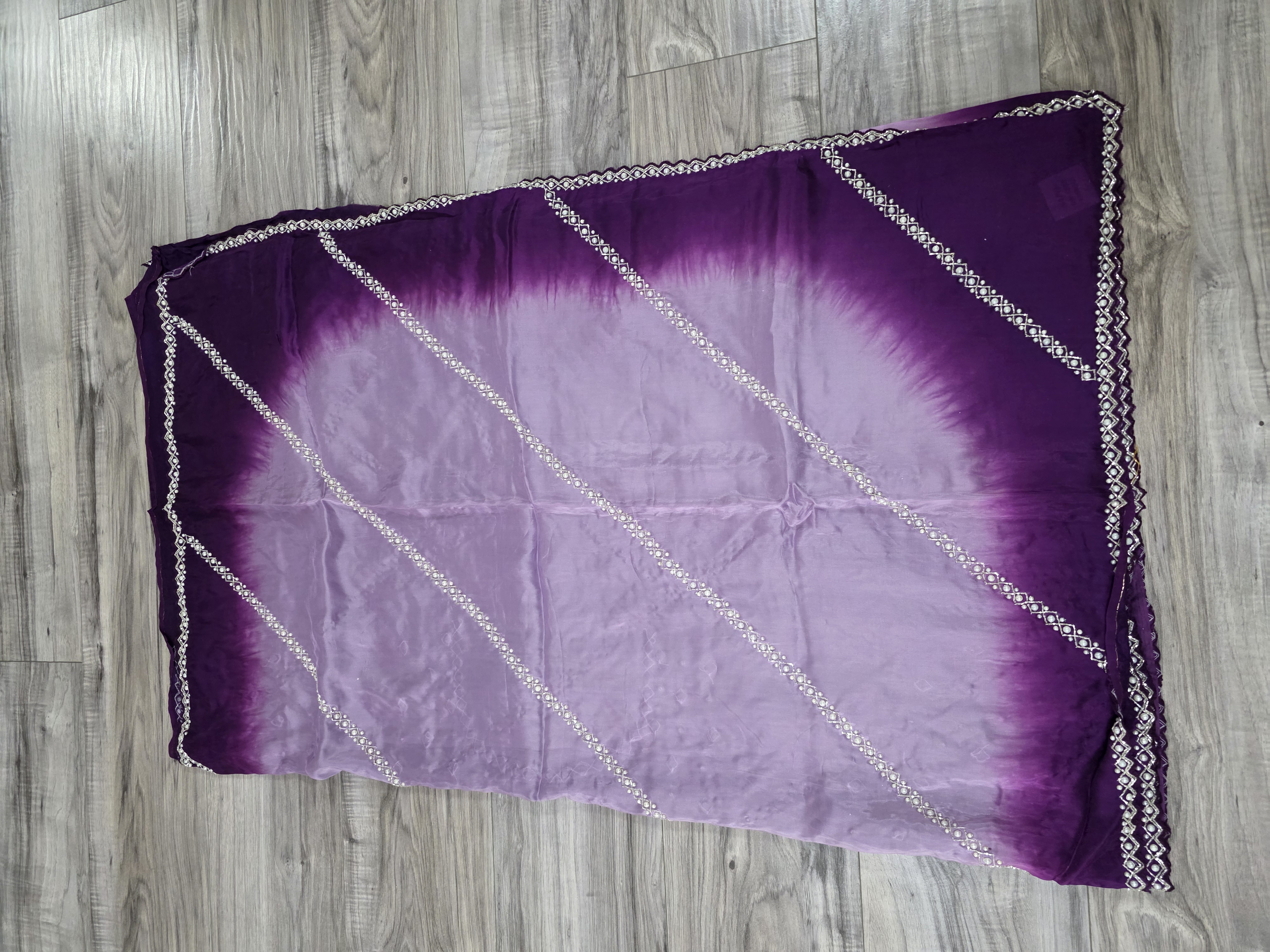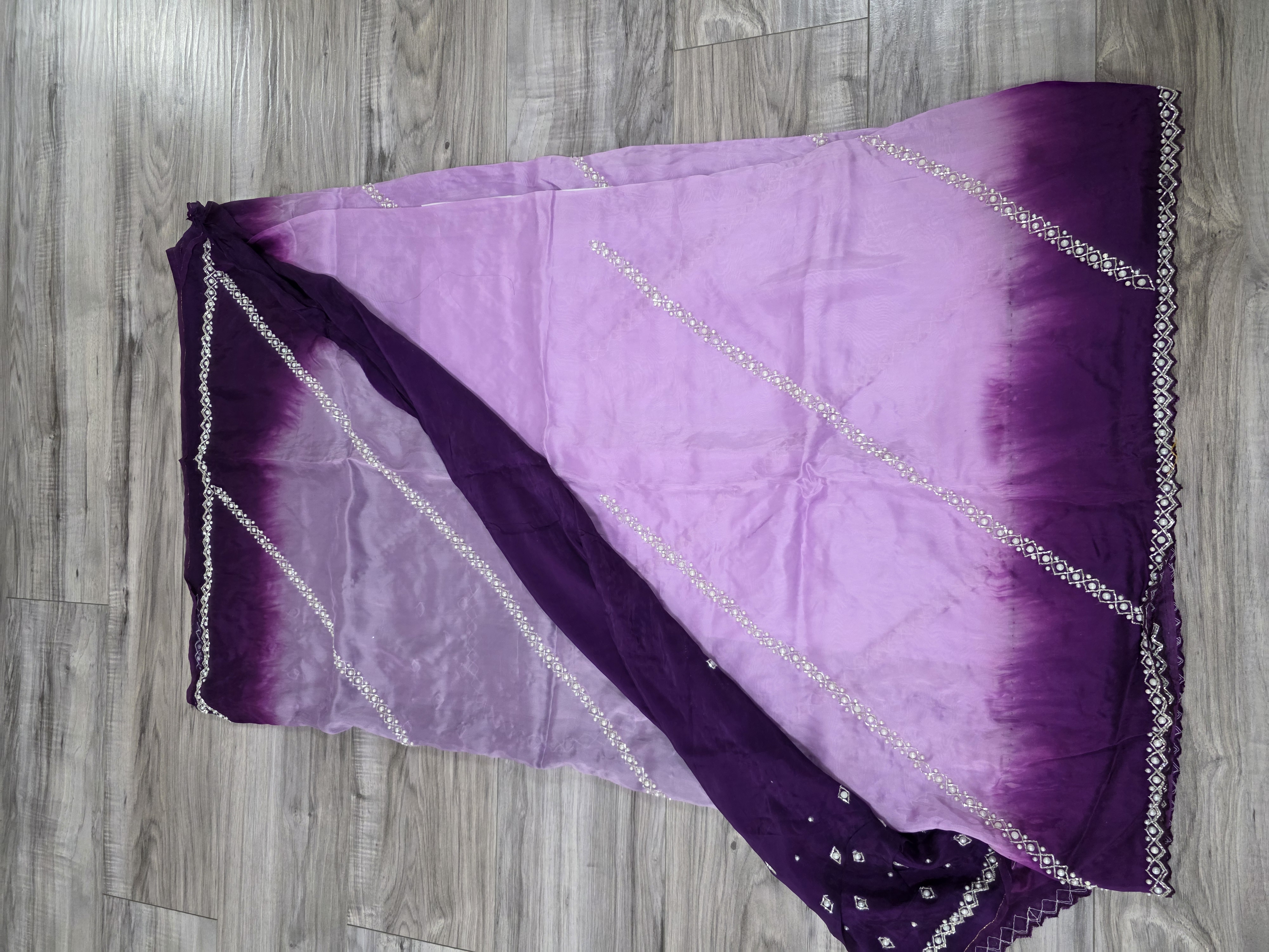 This is a contemporary purple and lavender ombre h.o.silk saree featuring a distinctive diagonal silver sequin "Leheriya" pattern and an embroidered border, paired with a matching solid purple blouse. Hand work done using pearl, kutdana all over sari and blouse