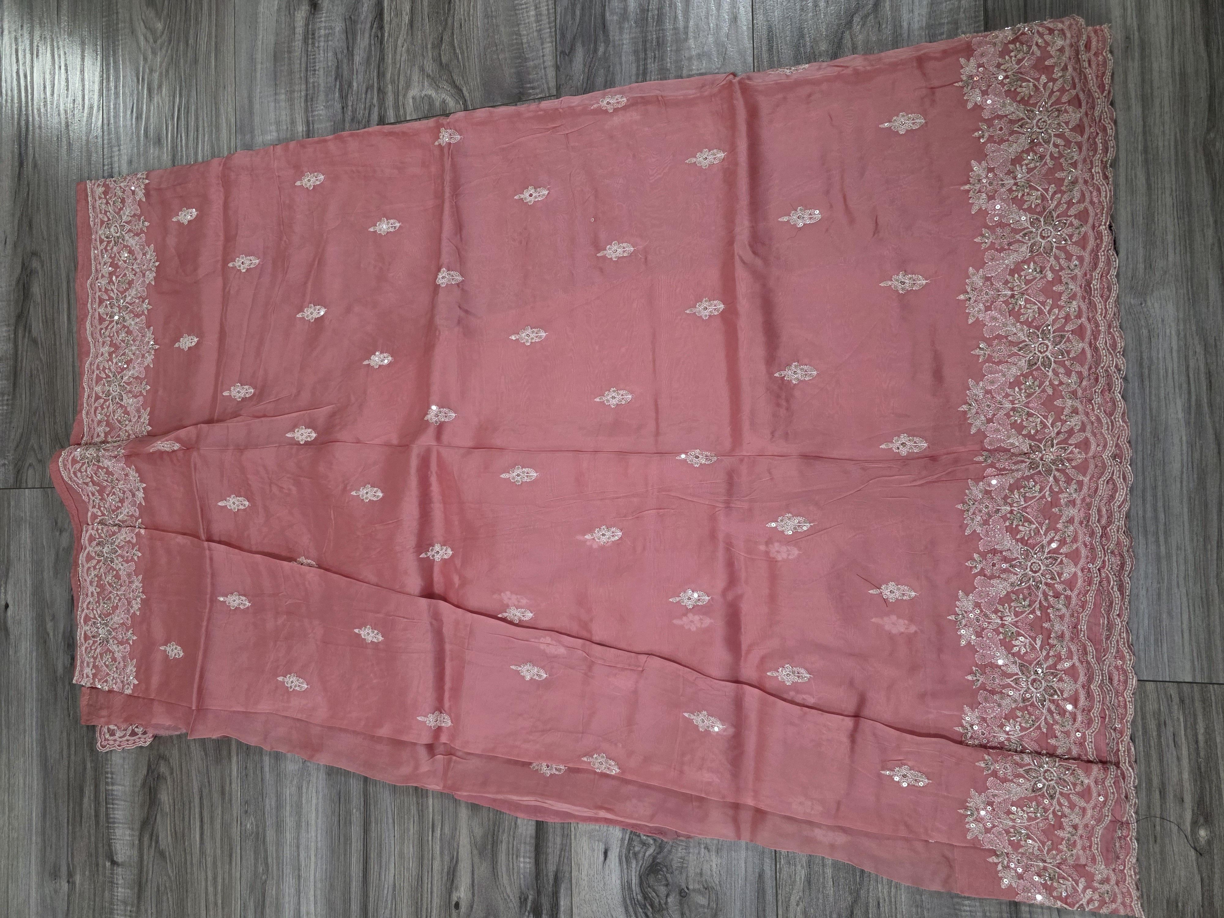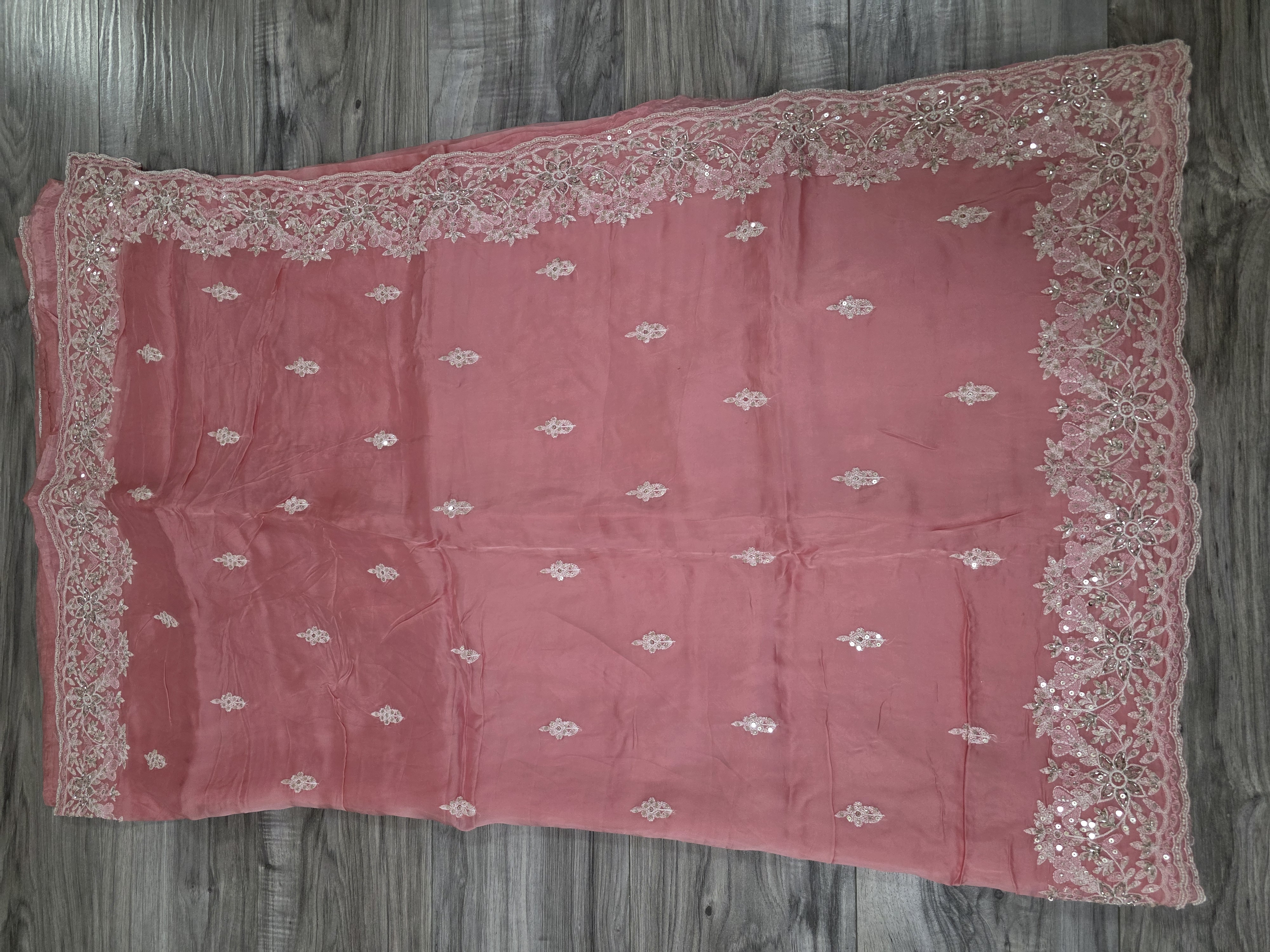 An elegant, light -pink H.O. Silk sari featuring intricate silver zari, thread and kutdana embroidery all over the sari and matching blouse .
