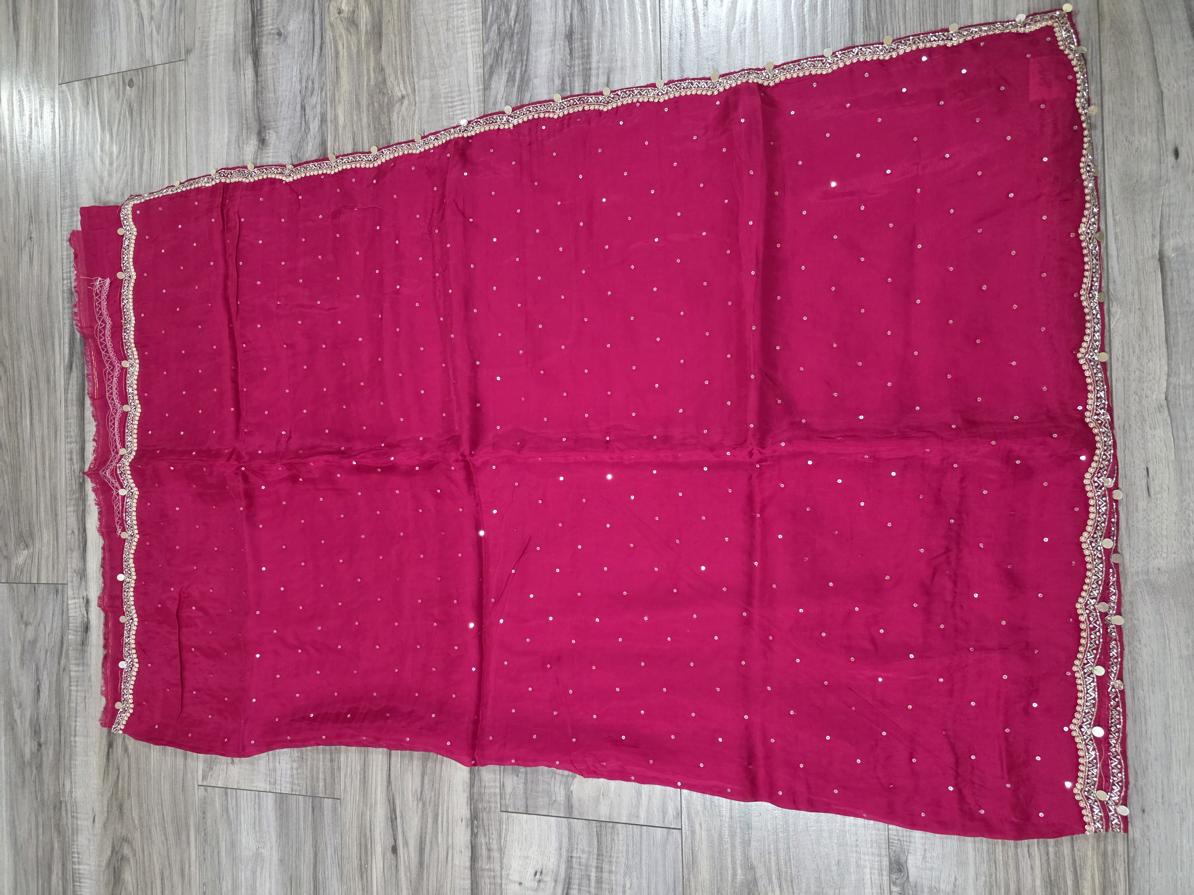 An elegant, magenta-pink crape silk sari featuring delicate silver sequin accents and a decorative beaded scalloped border.