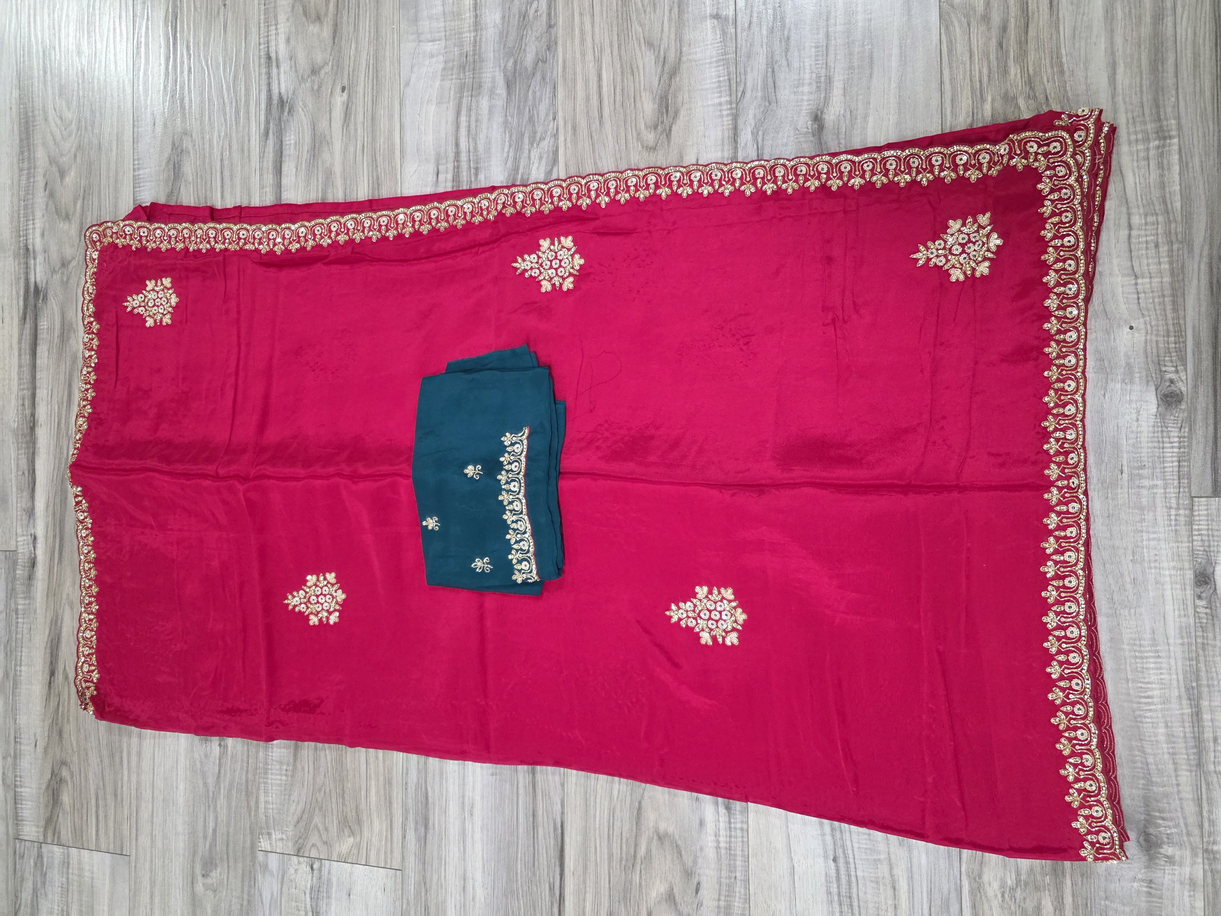 A vibrant magenta crape silk saree featuring intricate gold zari embroidery along the borders and pallu, elegantly paired with a contrasting dark teal embellished blouse.