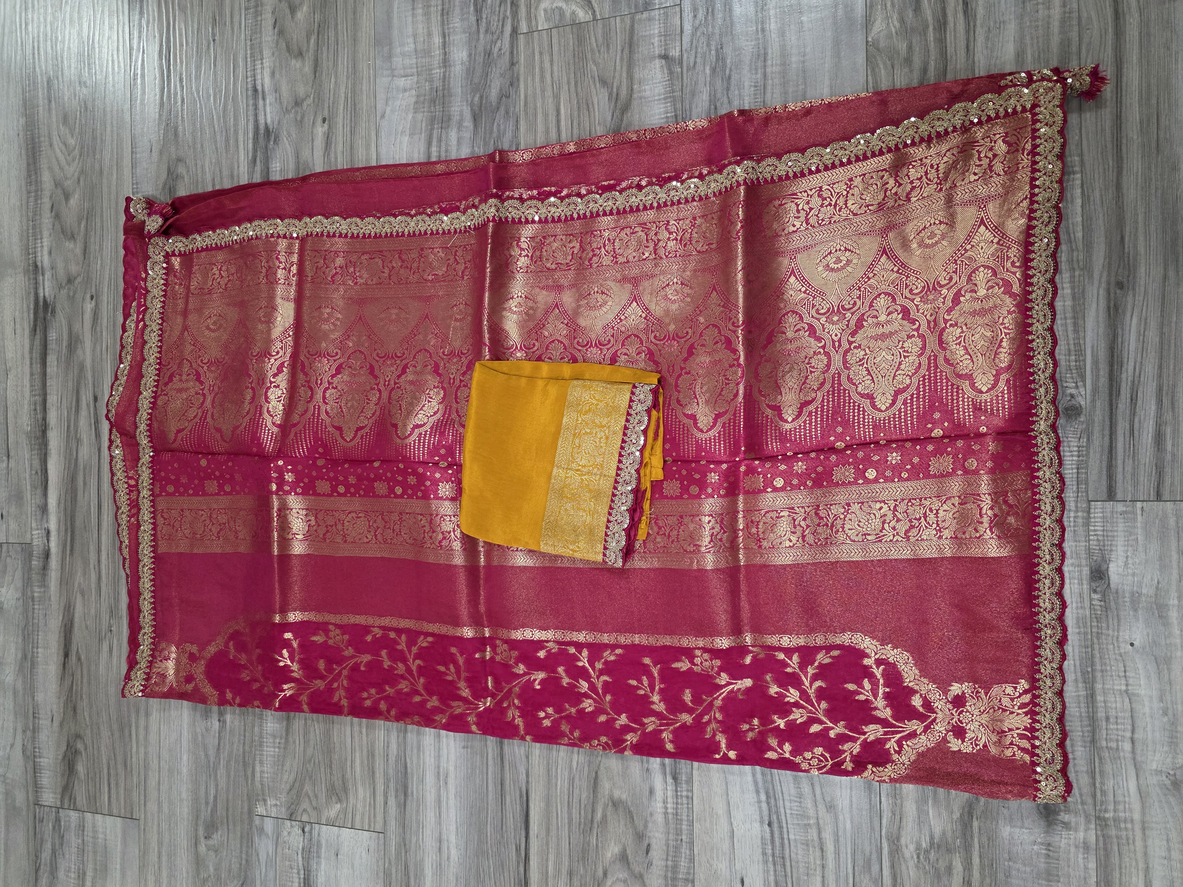 A vibrant pink Banarasi silk sari featuring intricate gold zari floral motifs, elegantly paired with a contrasting mustard yellow blouse.