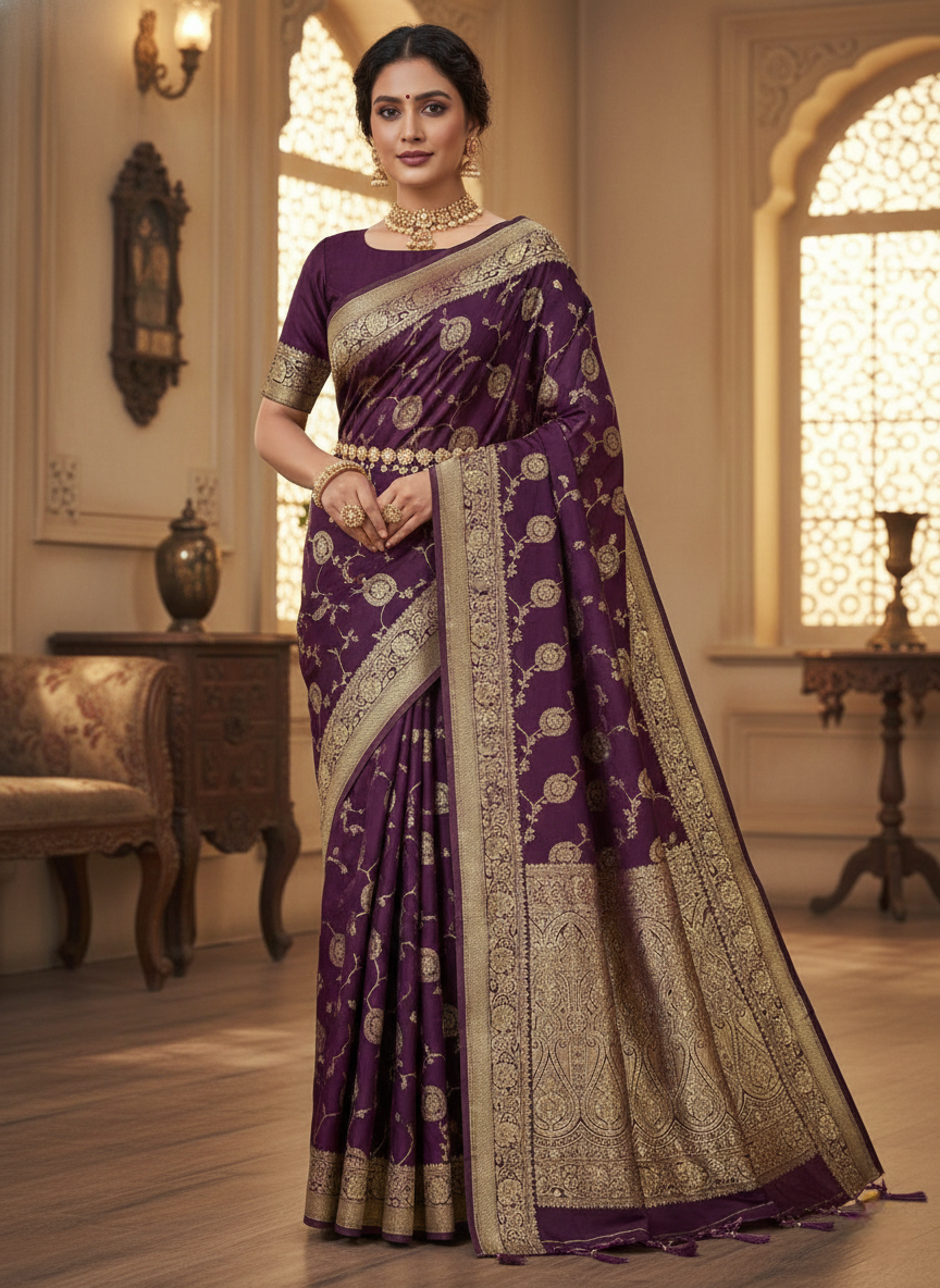 This is a sophisticated deep purple Banarasi silk sari featuring intricate golden floral motifs and a broad, ornate zari border.