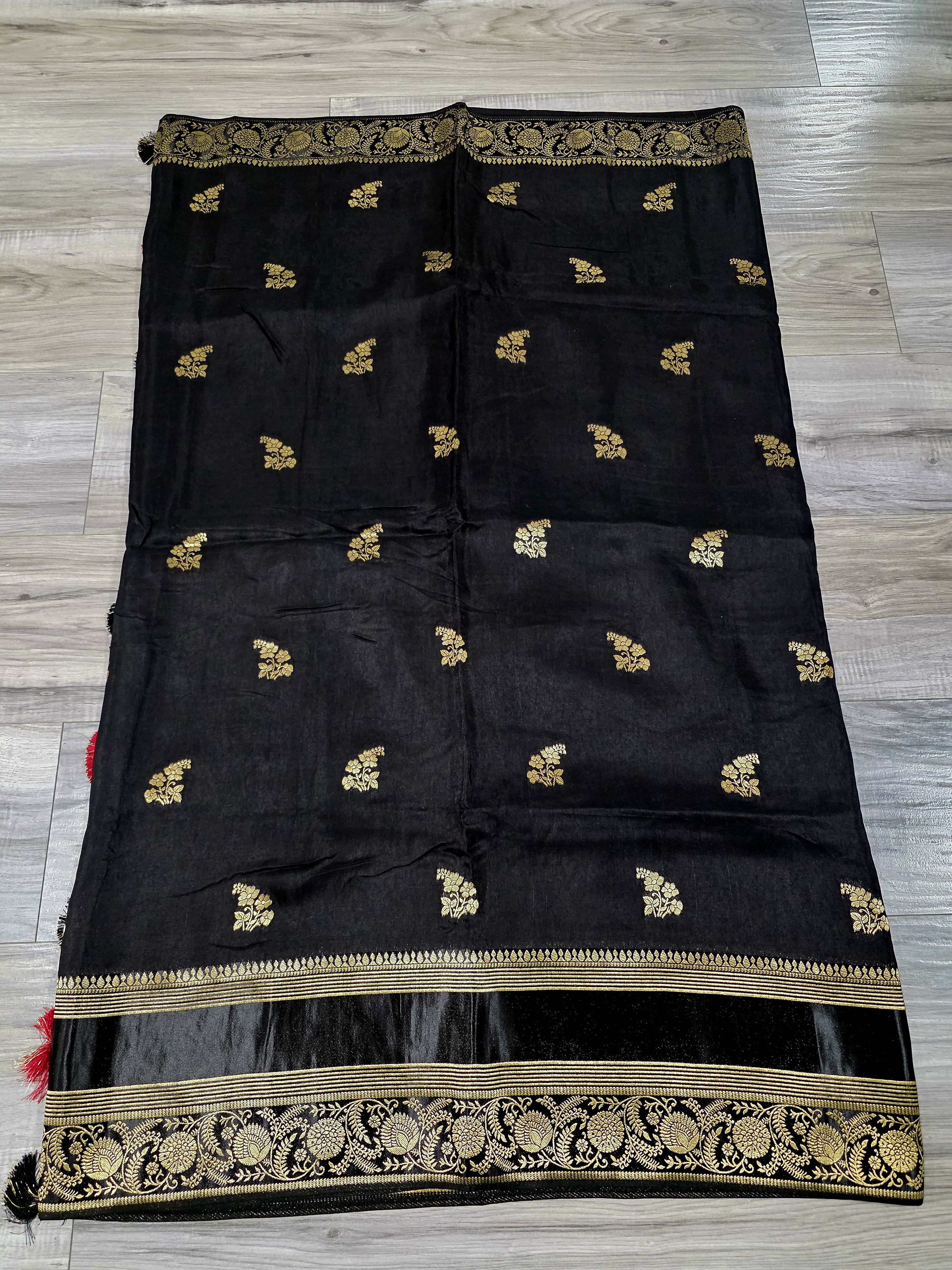 A sophisticated black Banarasi Dola silk sari adorned with ornate gold zari floral patterns, paired with a matching blouse