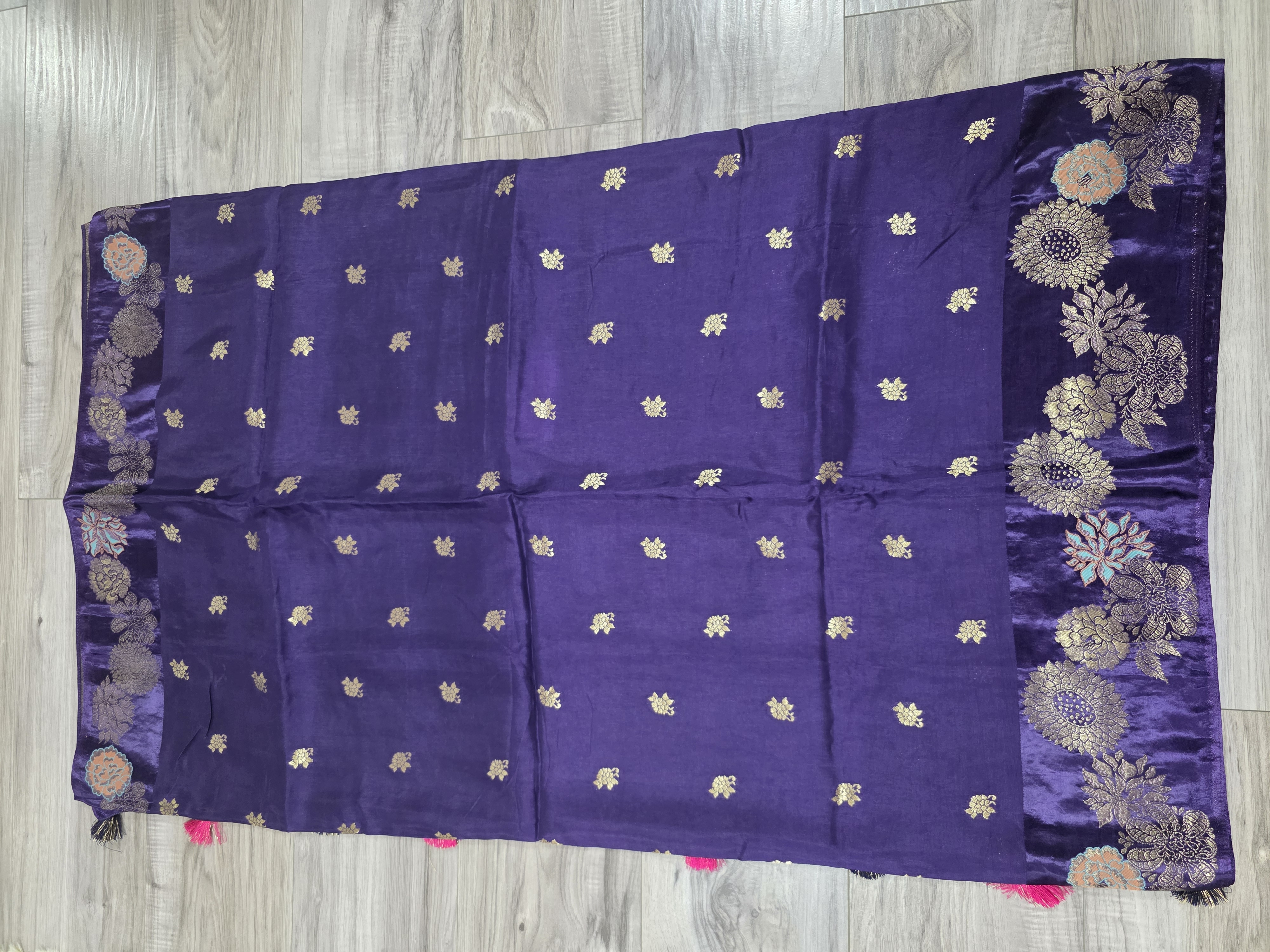 This is a rich purple silk Banarasi sari featuring intricate gold zari floral motifs and a traditional ornate border, paired with a matching blouse.