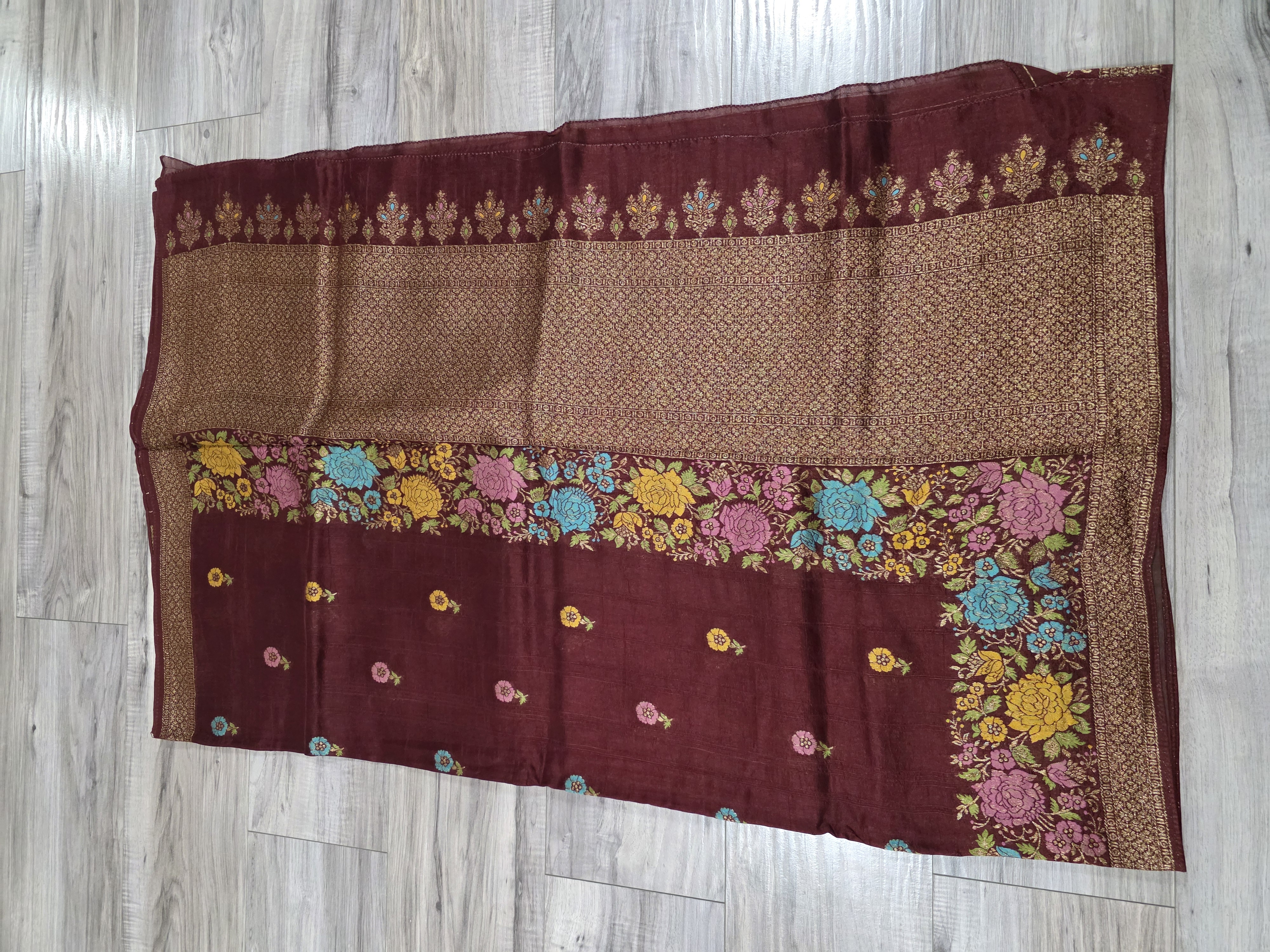 This is an elegant deep maroon Banarasi silk sari featuring an intricate gold zari border and a vibrant floral embroidered pallu, paired with a blouse.