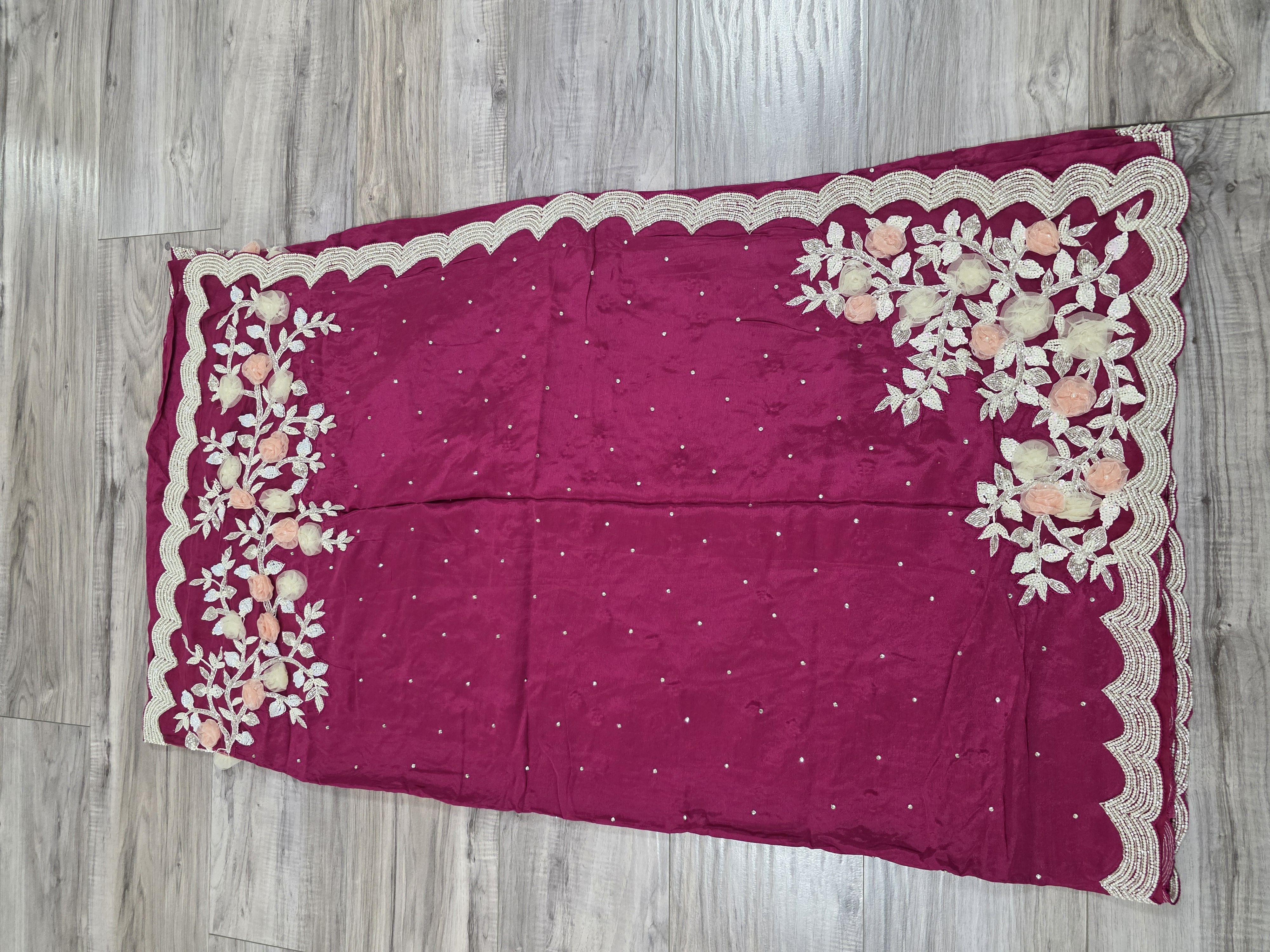 An elegant magenta-purple silk saree featuring an intricate pearl work scalloped border and delicate floral embroidery