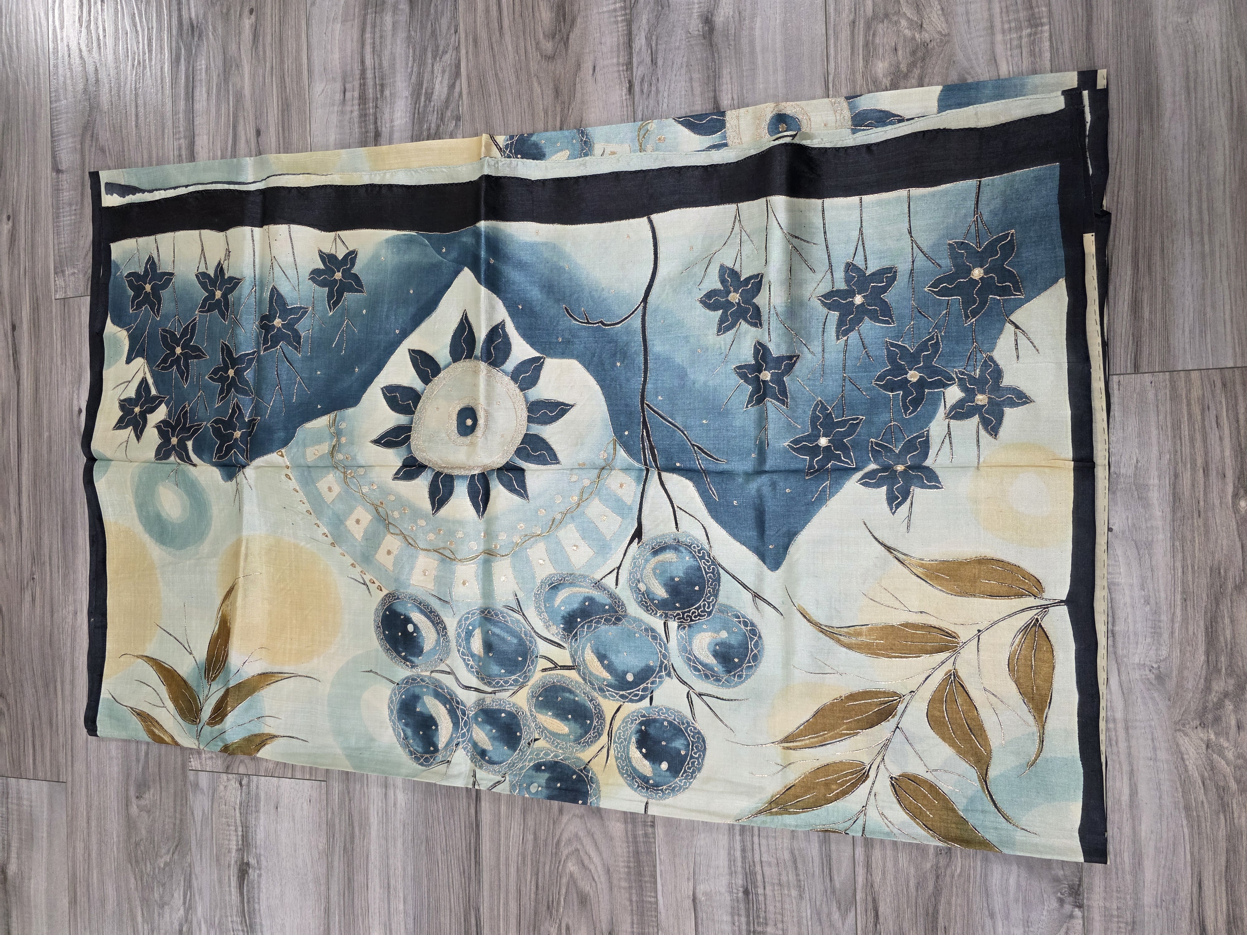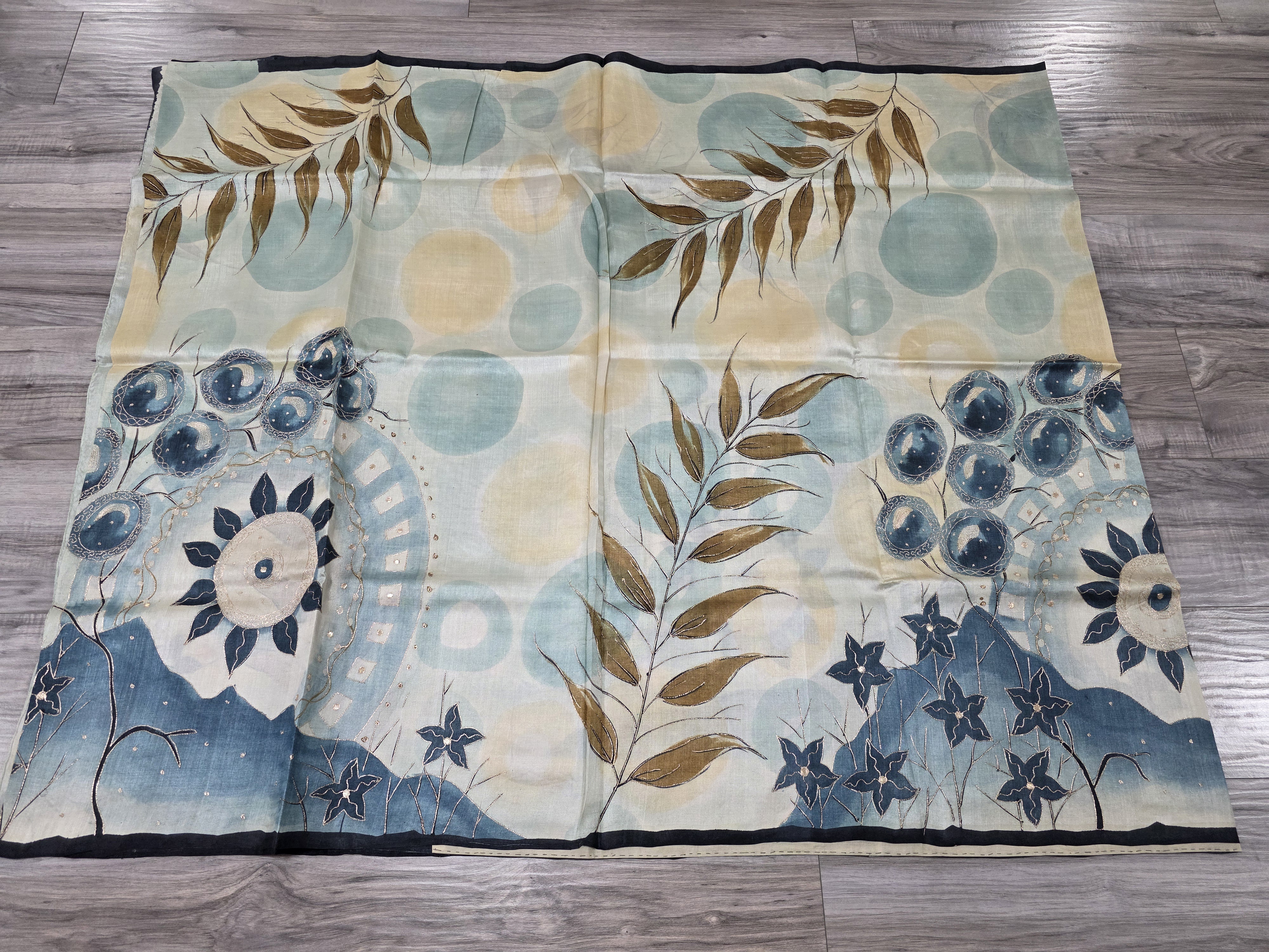 This is made in pure tussar silk fabric with hand paint and a highlights of gold zari embroidery outline all along the floral pattern
