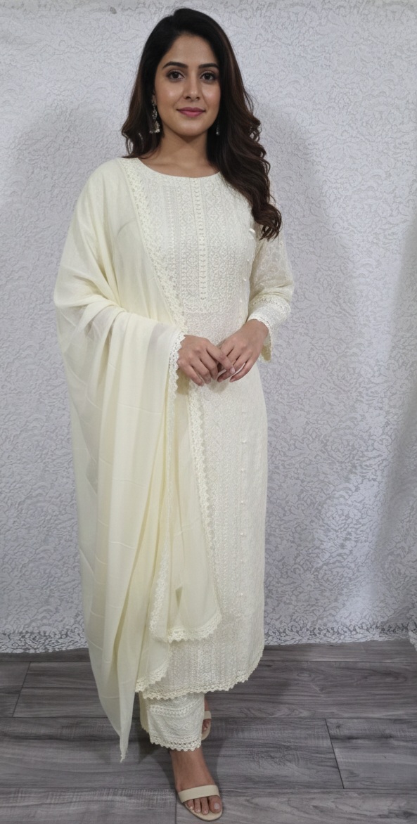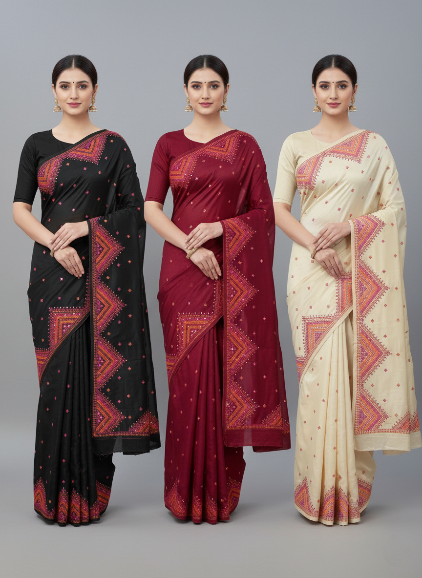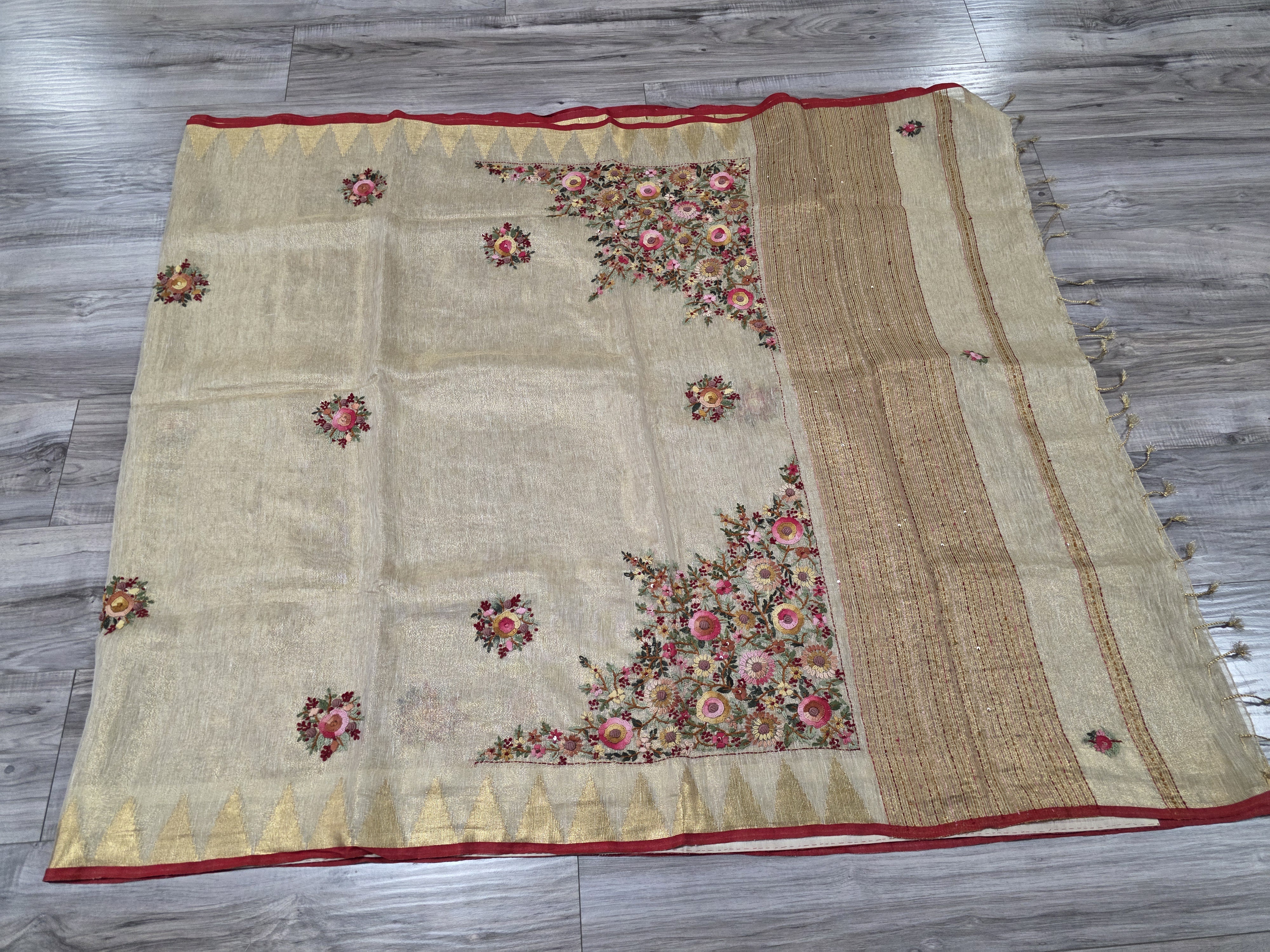 This elegant beige linen tissue silk sari features a thin red border and intricate floral thread-work embroidery accented with delicate sequin highlights on the pallu and body.
