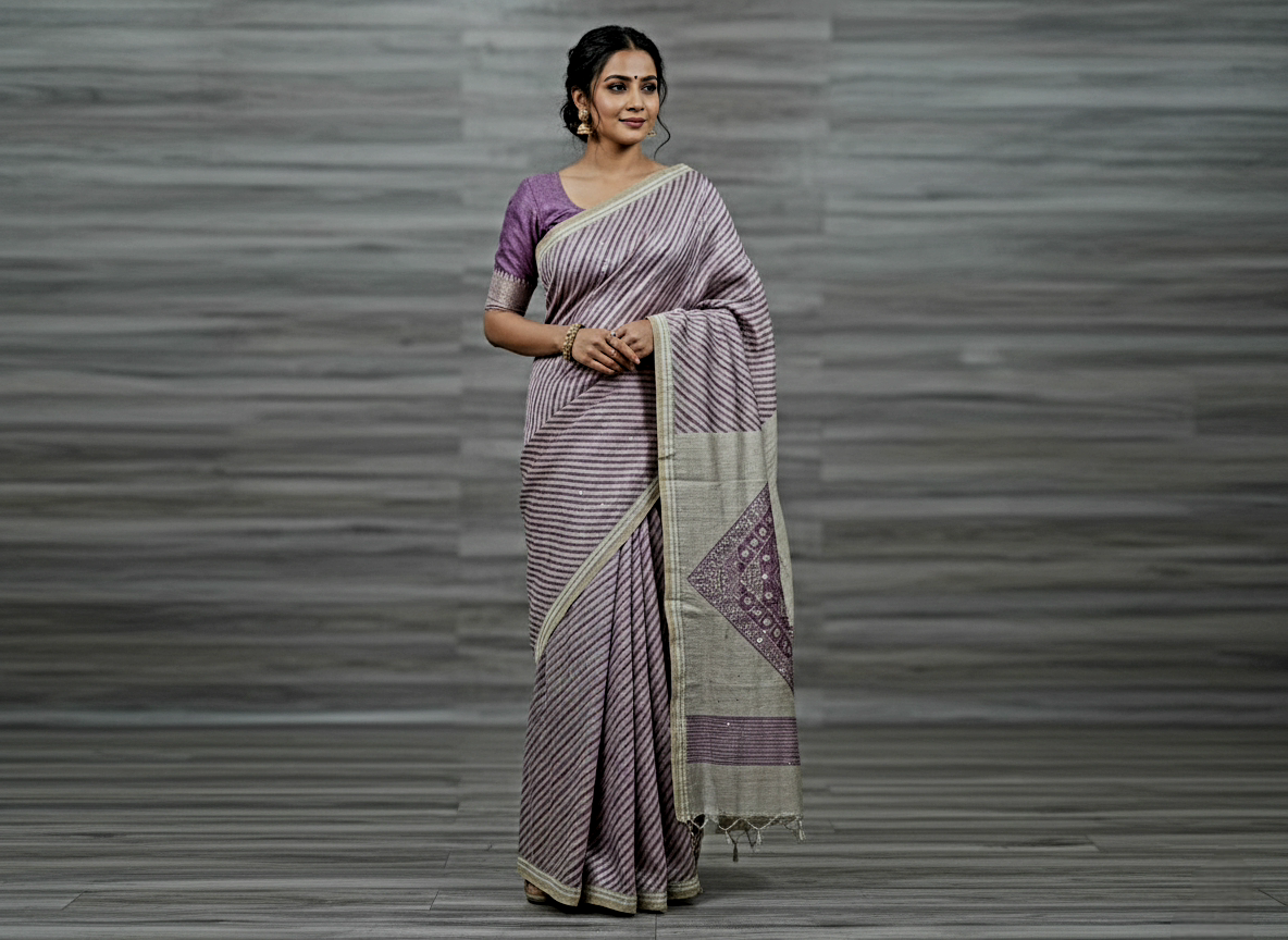 This is a sophisticated lavender and cream, and mustard and mehndi green striped sari made in semi tussar soft silk fabric featuring a detailed geometric pallu and a coordinating solid blouse blouse.