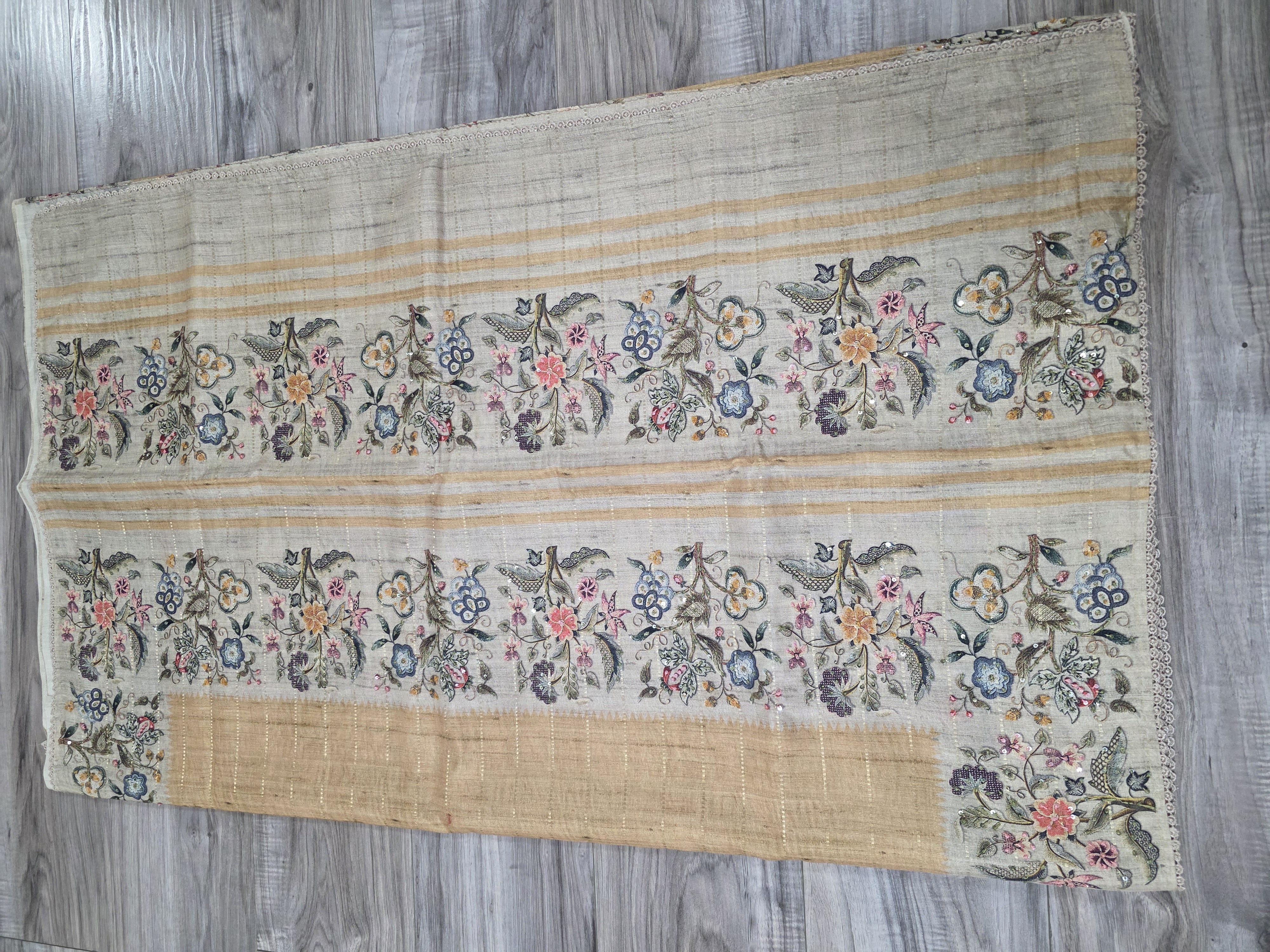 This beige semi tussar soft silk fabric sari has contrast floral border and pallu with hand work done using sequin and thread