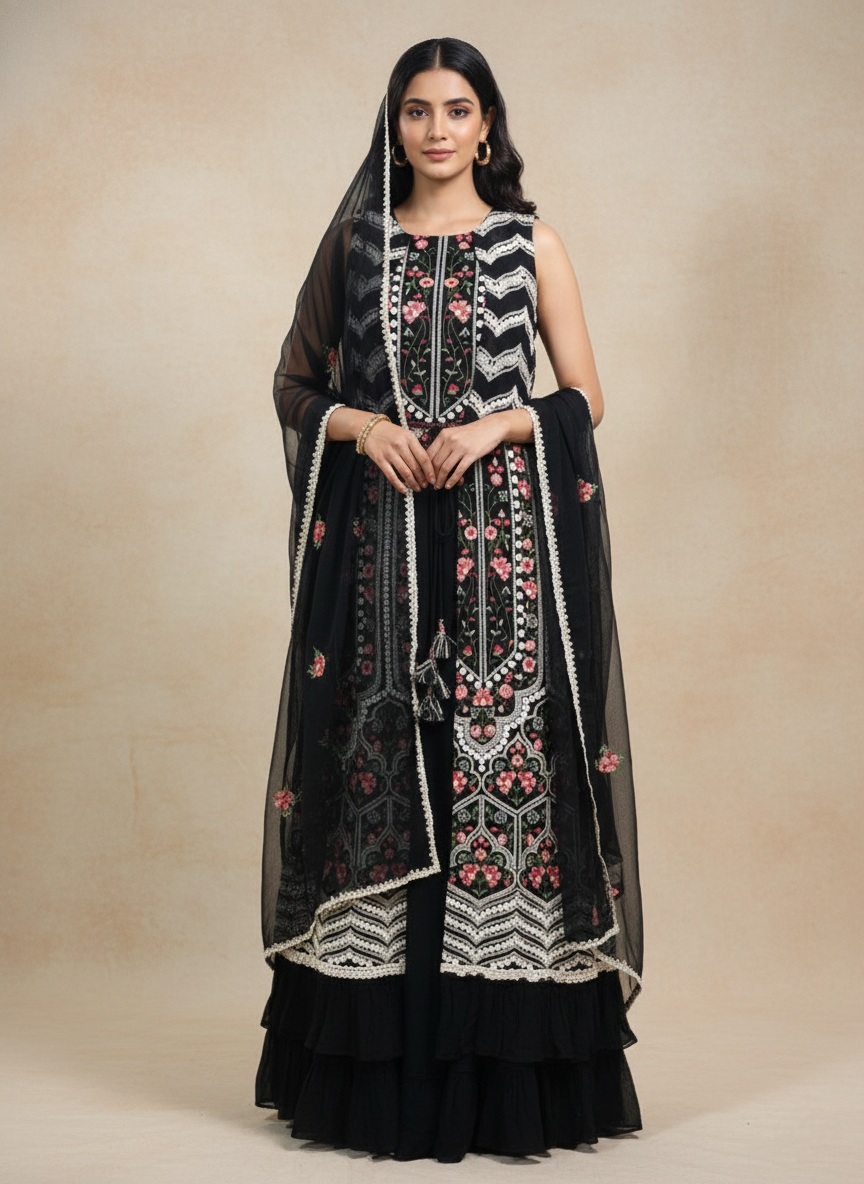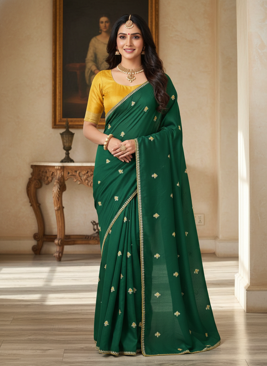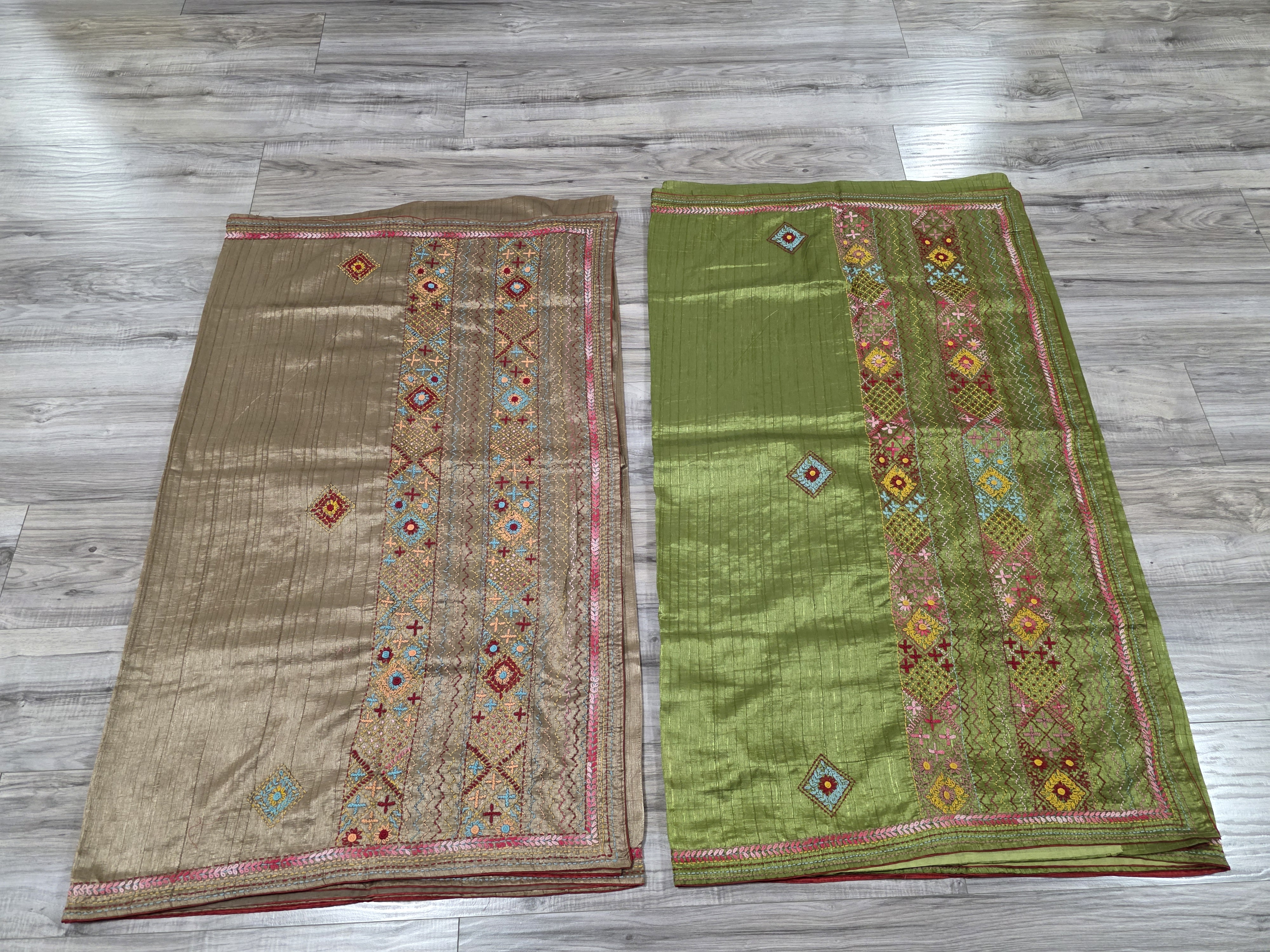 An elegant pair of silk saris featuring intricate geometric embroidery on the borders and pallu, shown in sophisticated champagne gold and olive green shades.
