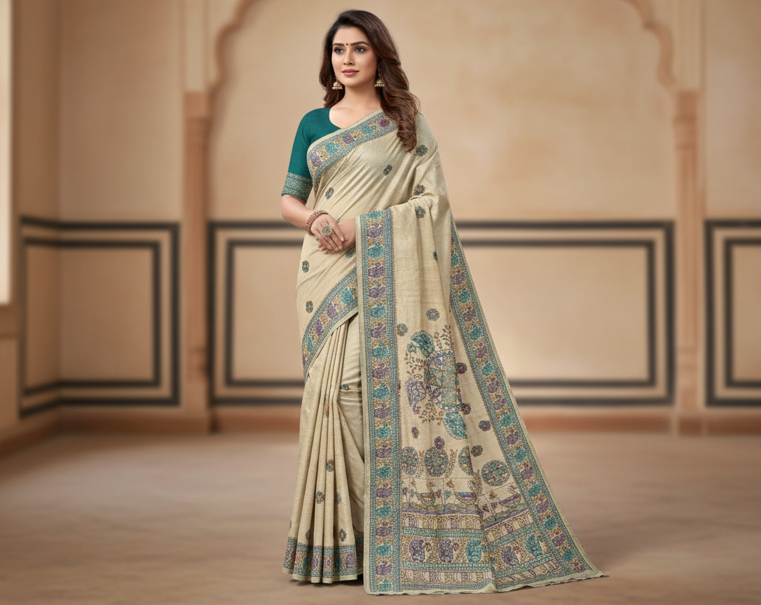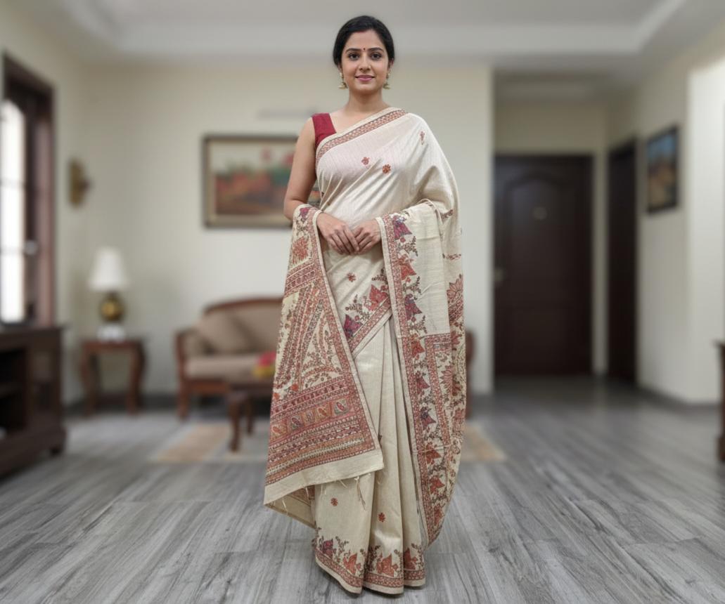 This elegant cream-colored Tussar silk sari features a sophisticated border and pallu adorned with intricate hand-painted Kalamkari peacock motifs and floral patterns in shades of teal, mauve, and ochre.