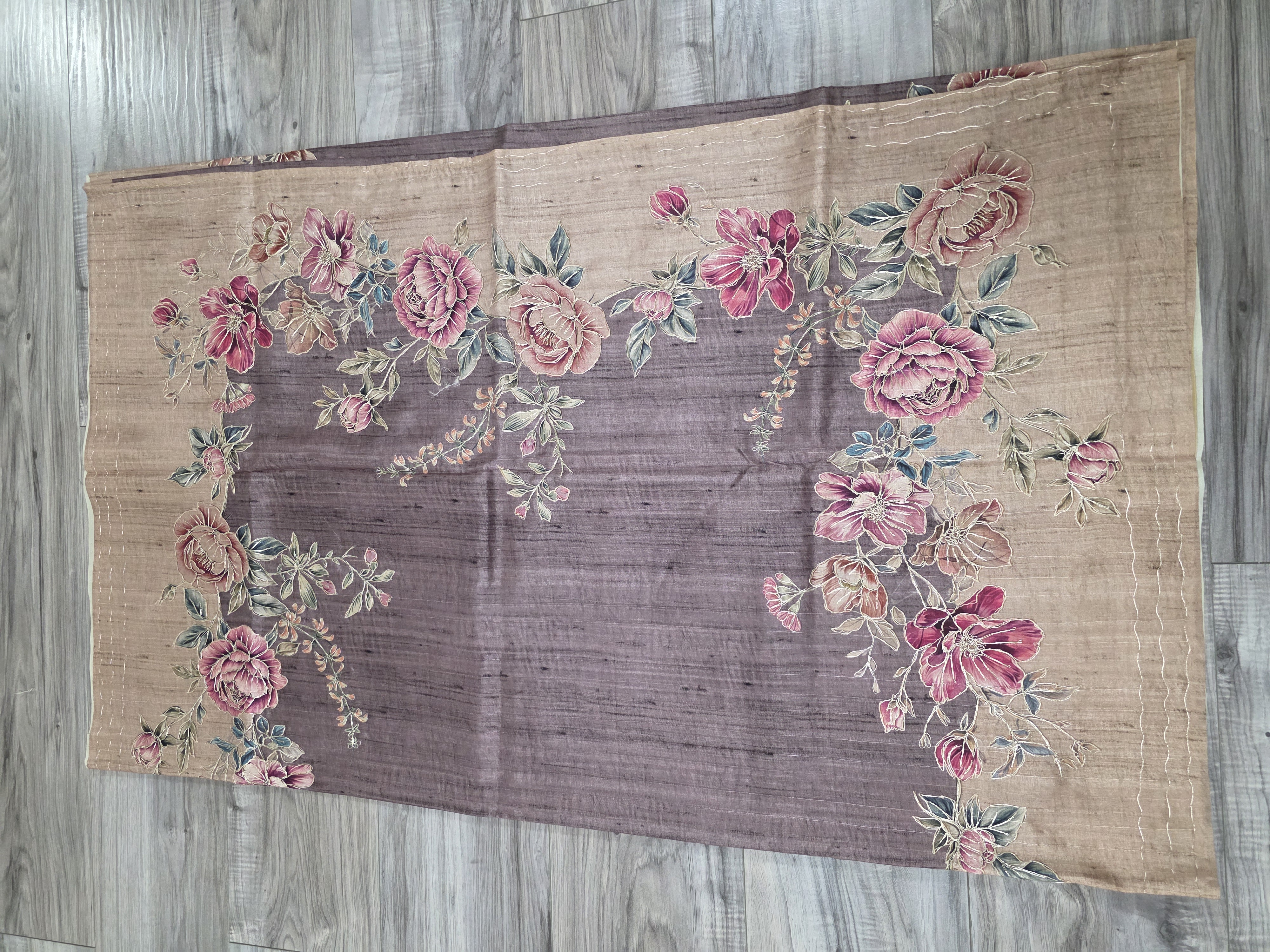 An elegant, semi tussar silk sari featuring a soft floral print and a wide, contrasting zari-bordered pallu for a sophisticated ethnic look.