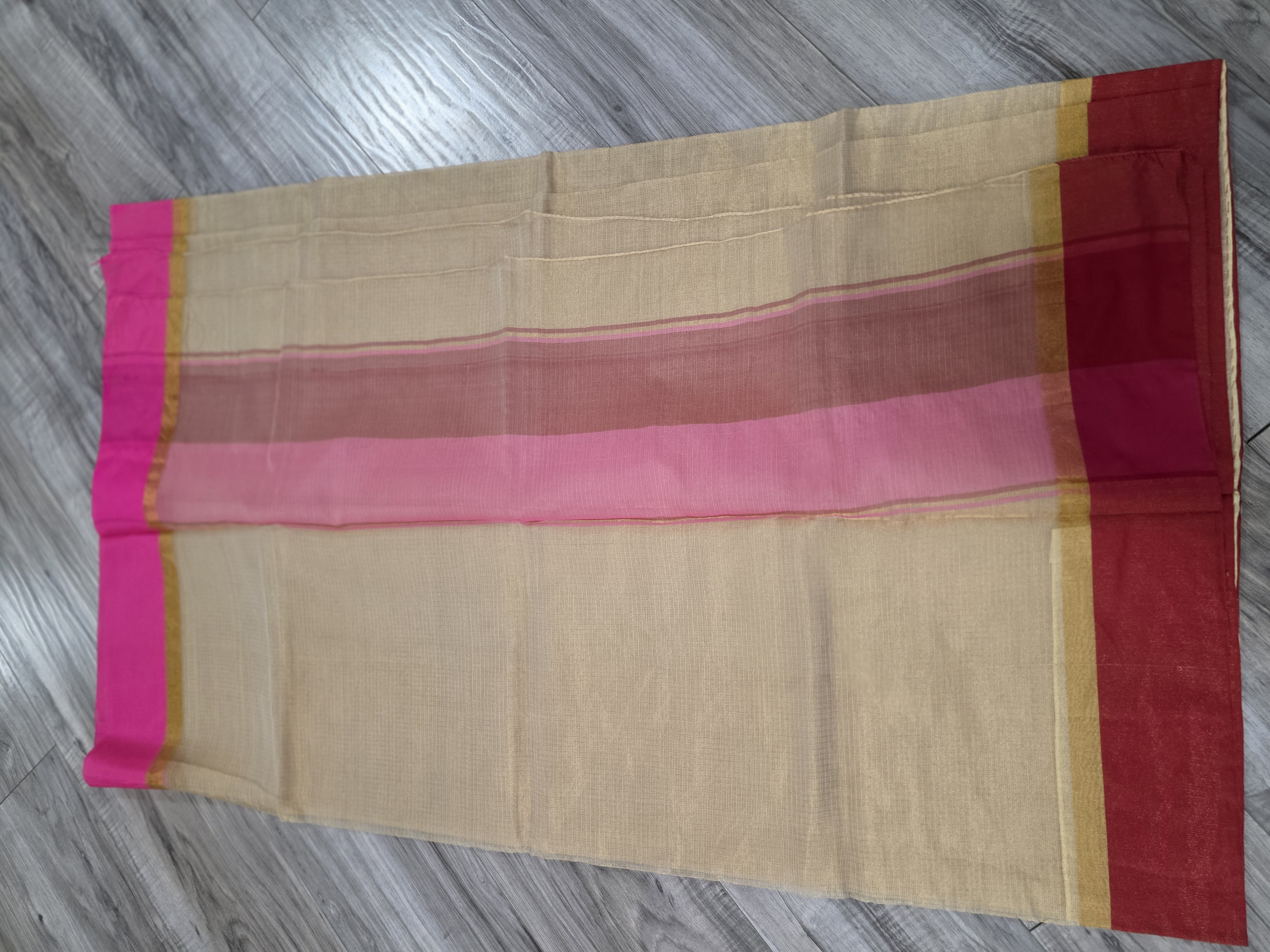 This is an elegant beige kota zari silk sari featuring a striking dual-tone border with red on the bottom and hot pink on the top, accented by subtle gold zari detailing.