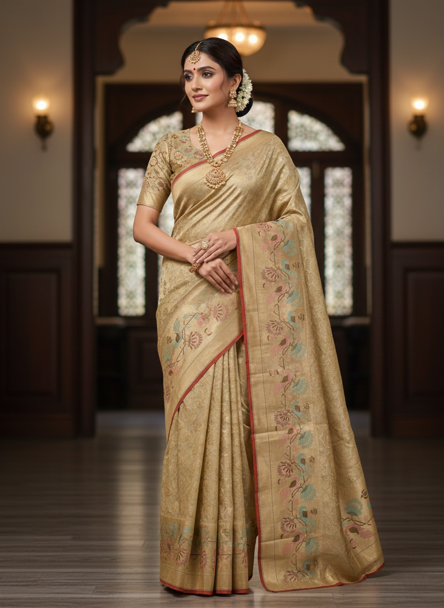 Cream Banarsi silk fancy sari