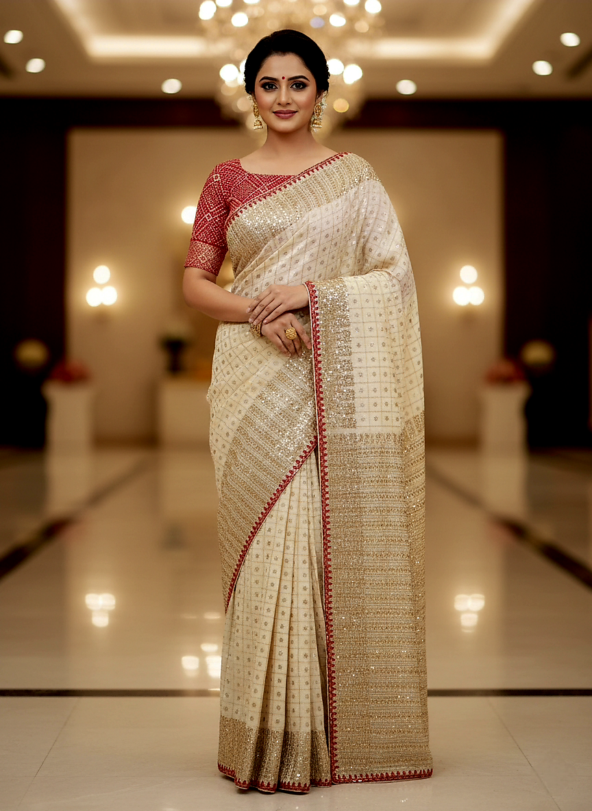 This elegant ensemble features a cream Banarasi silk saree with intricate gold zari work, paired with a vibrant red bandhani print blouse for a striking traditional contrast.