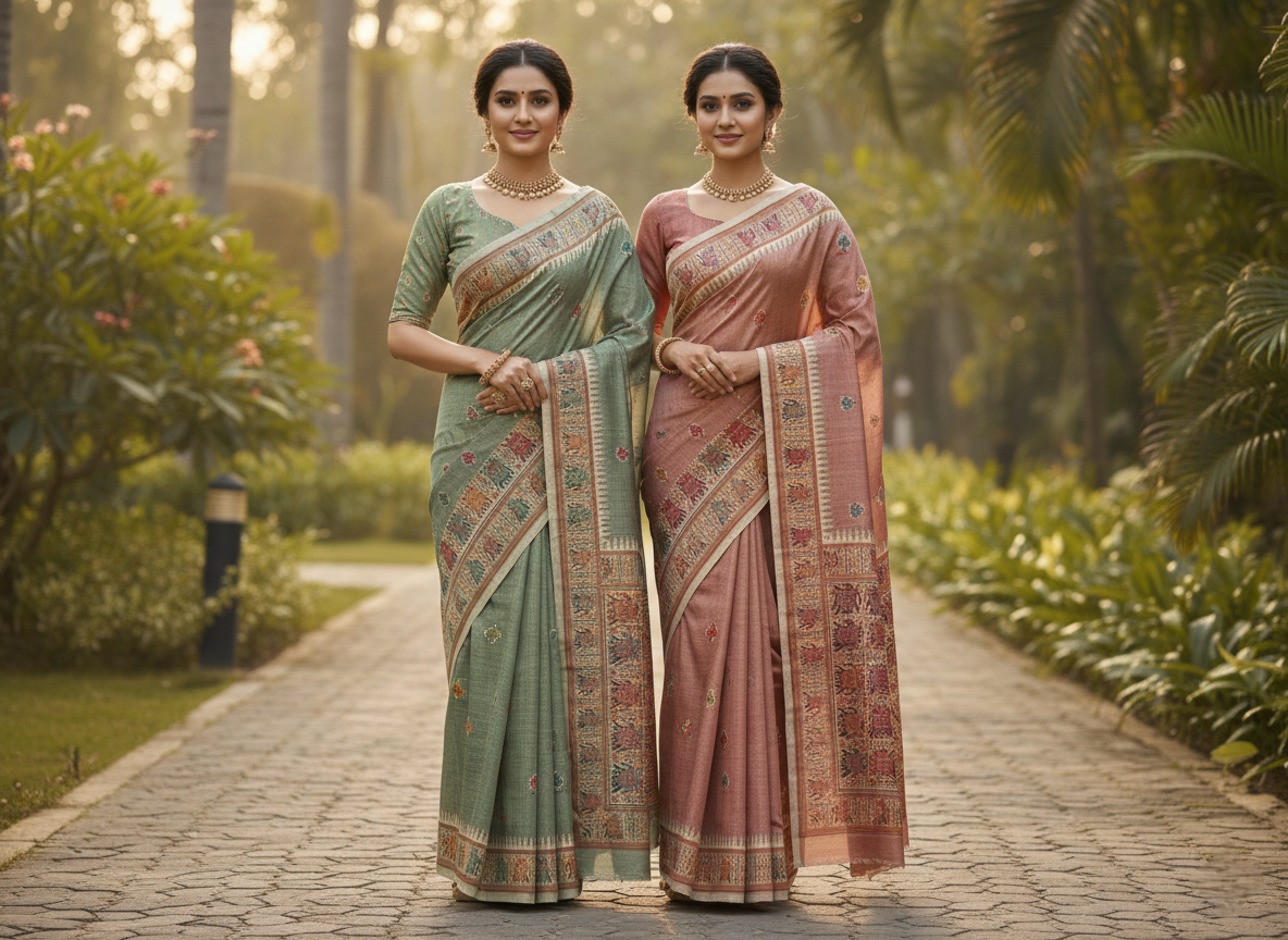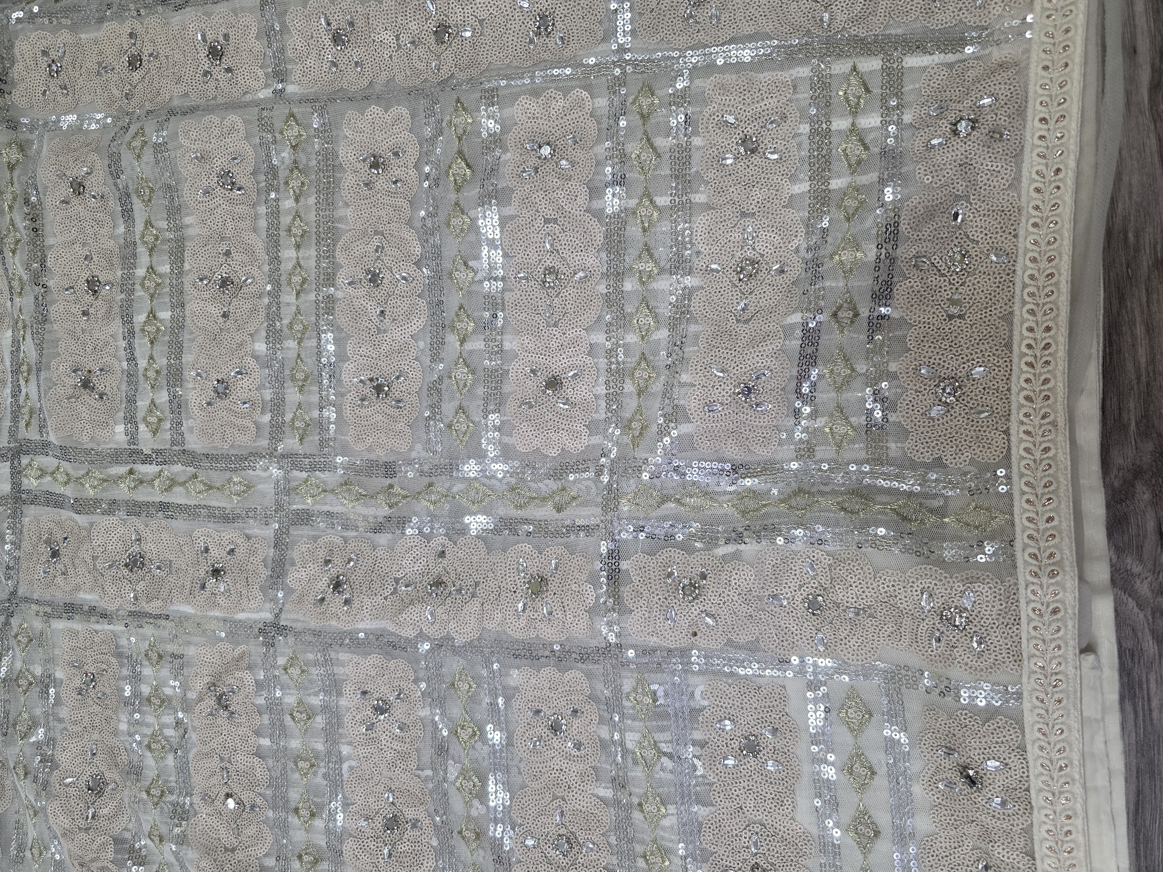 A sophisticated light ivory net saree detailed with shimmering sequins and exquisite threadwork, accented by a graceful silver-tasseled pallu