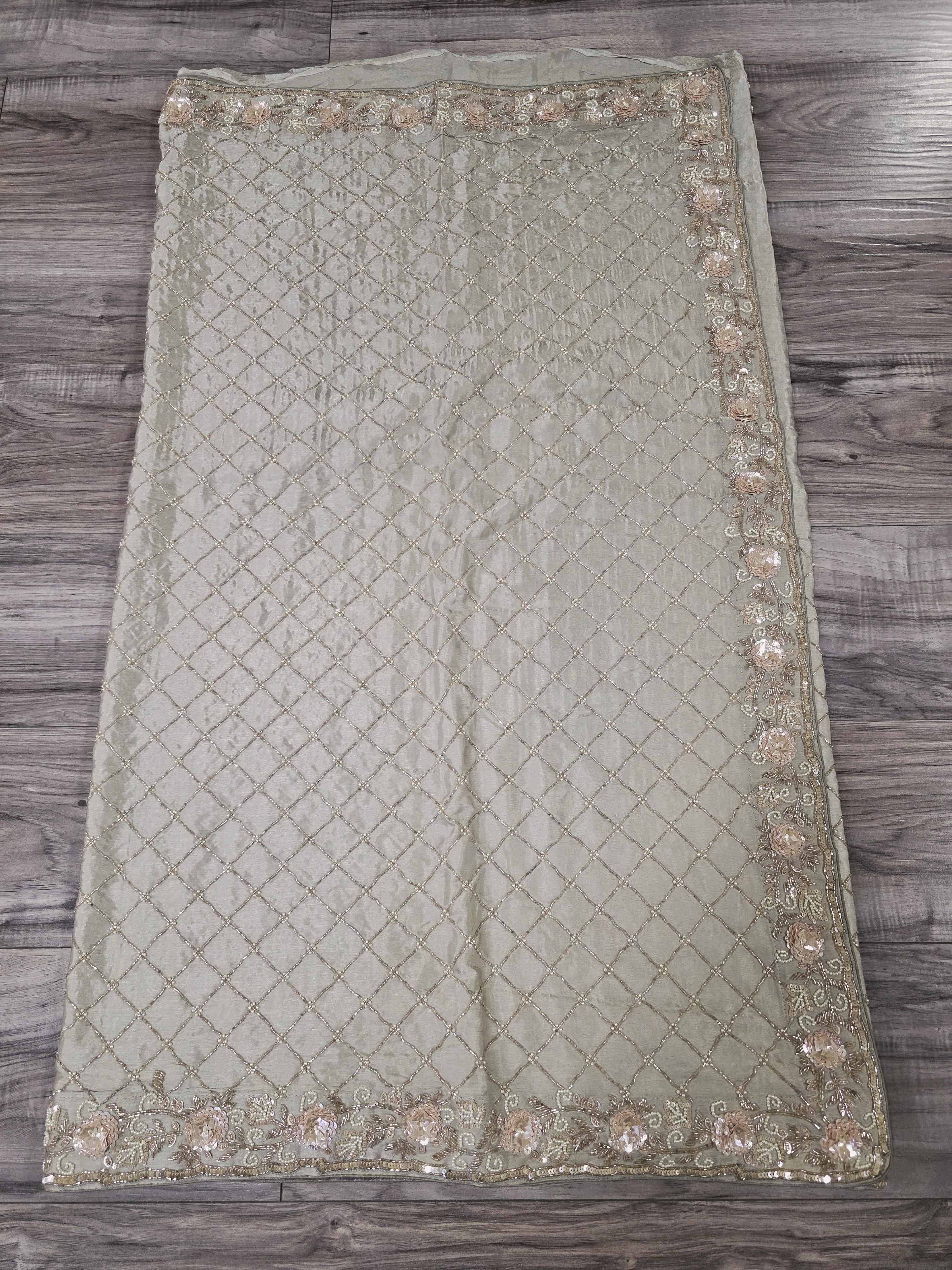 This is an elegant very light sage green crepe silk sari featuring a delicate thin border and intricate hand-embroidery of pearls, cutdana, and shimmering sequins spread across the fabric.
