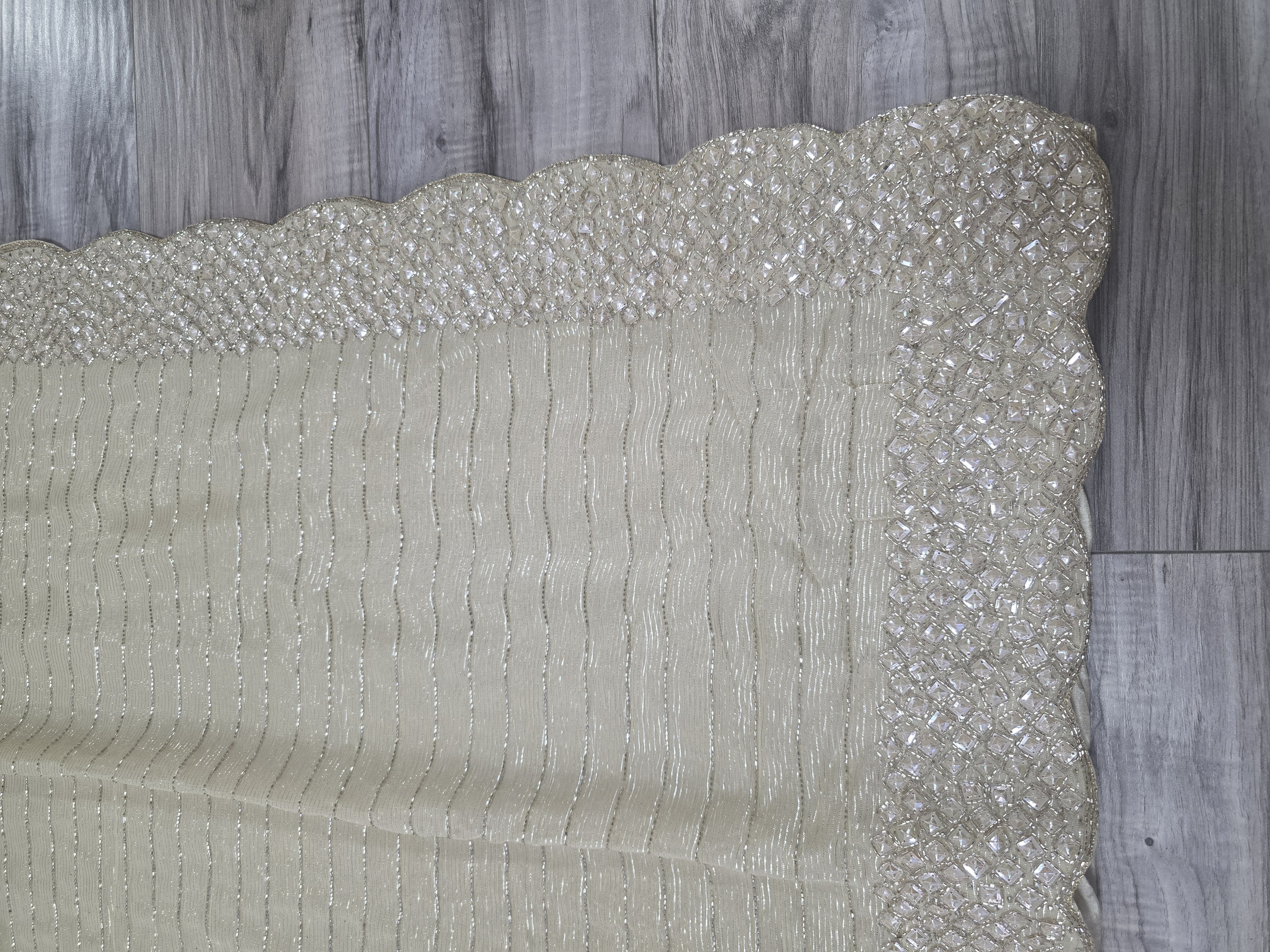 An elegant, off-white georgette sari featuring delicate horizontal shimmer stripes and a detailed, scalloped embroidery border.