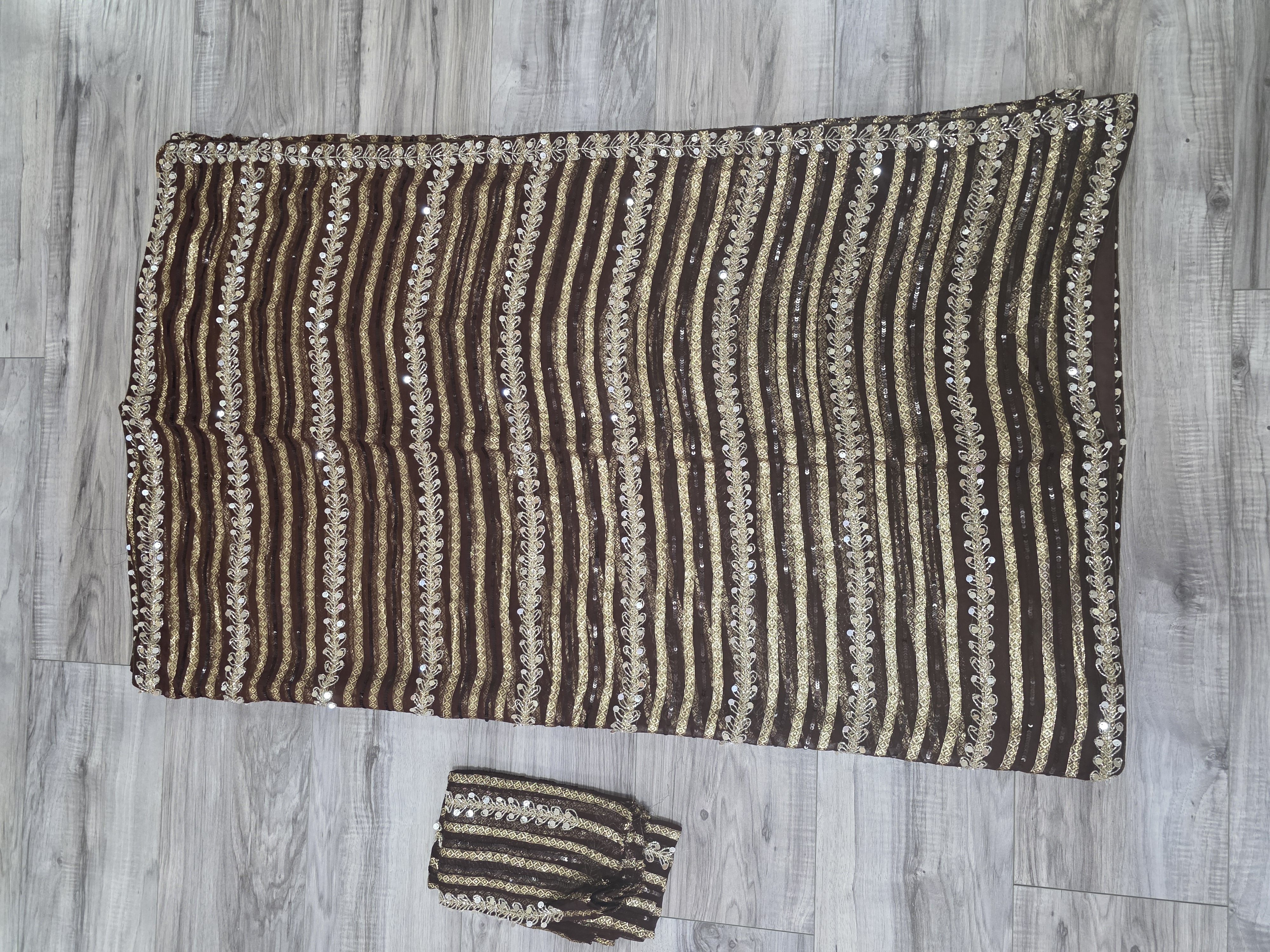An elegant coffee brown georgette sari featuring intricate all-over sequin and katdana work, paired with a matching blouse for a sophisticated, shimmering look.