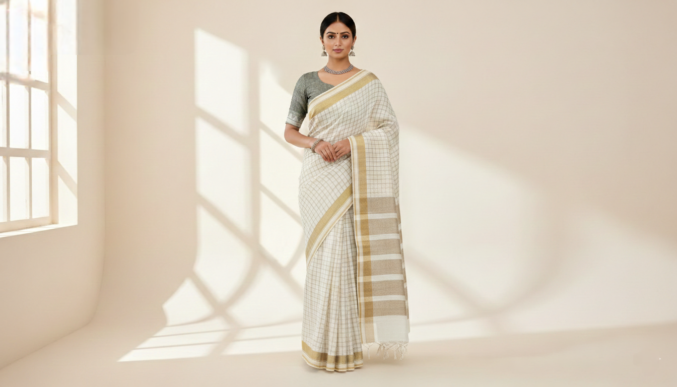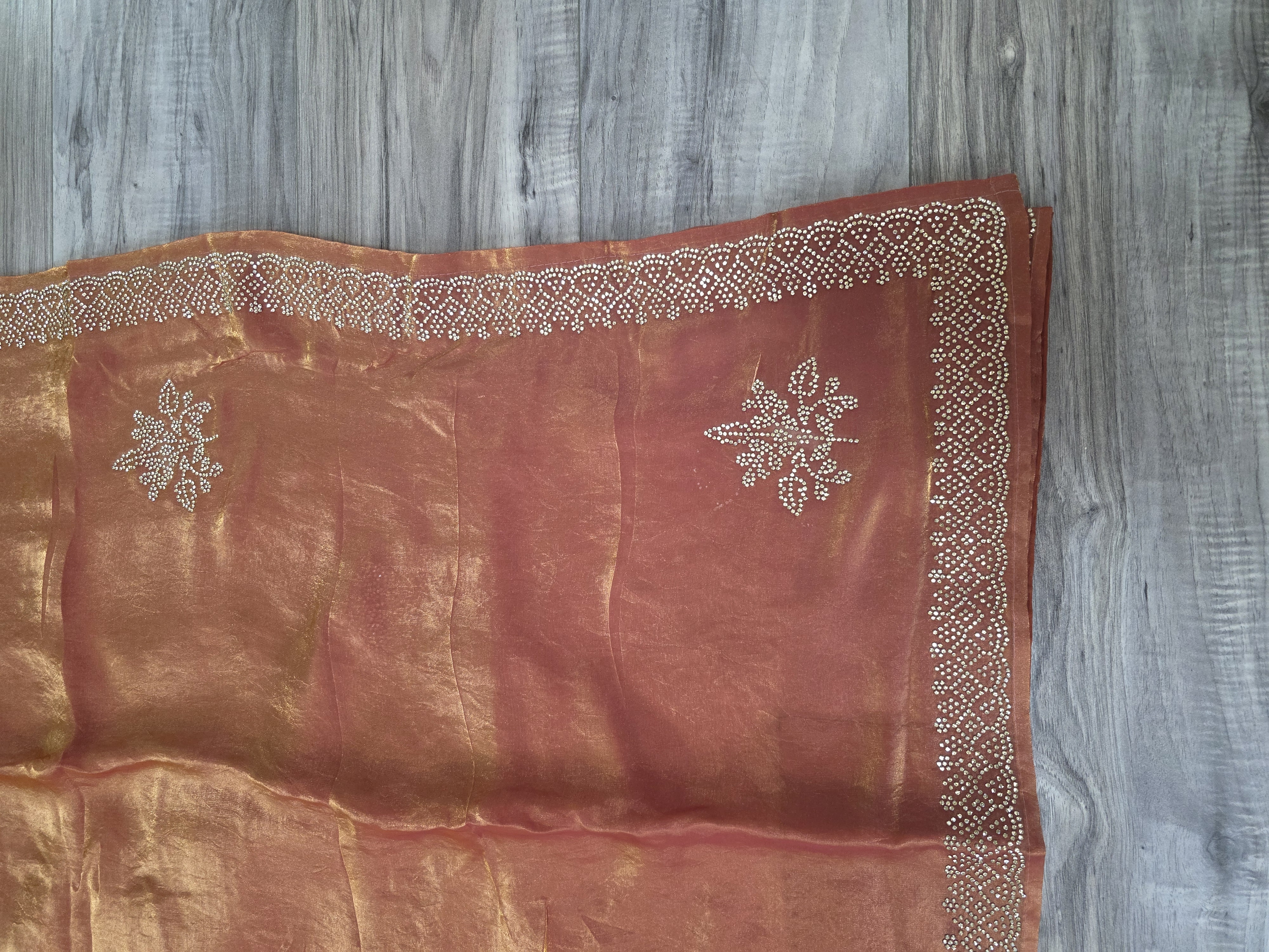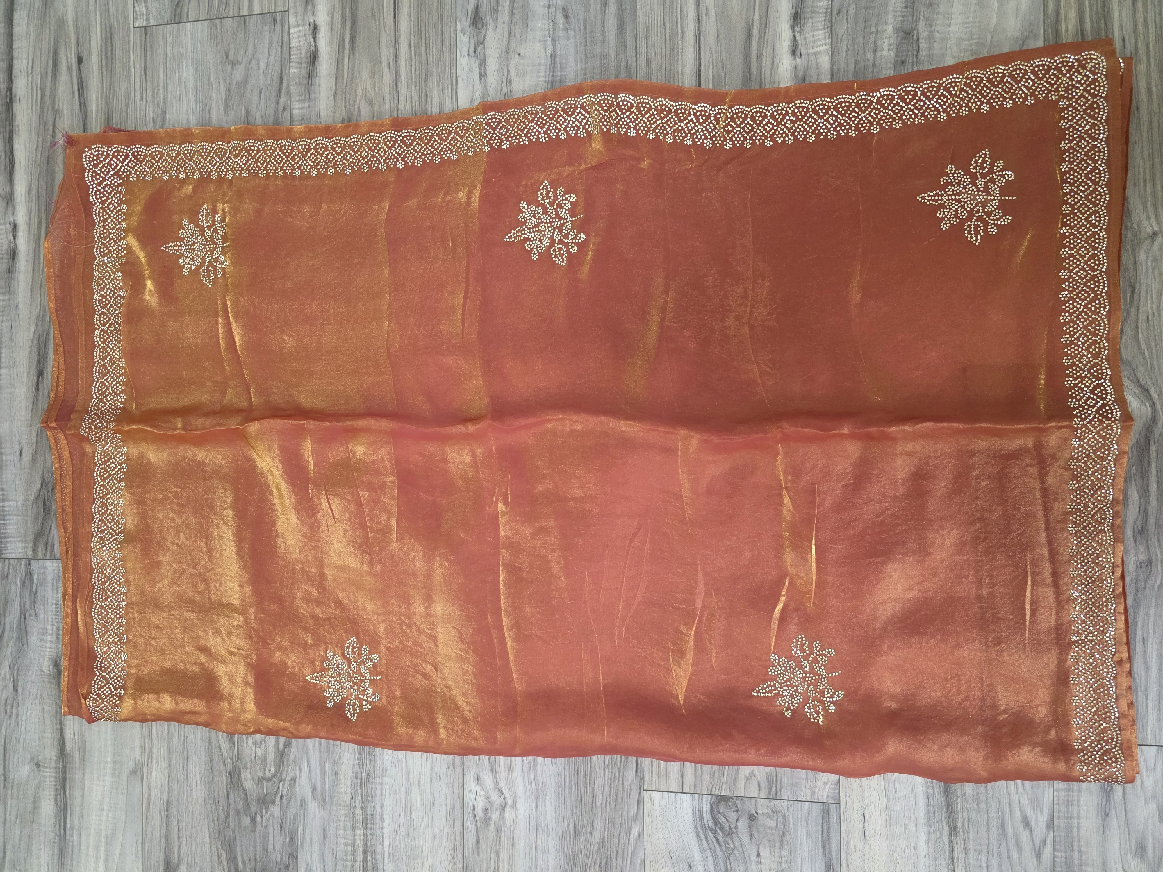 An elegant rusty gold fendi georgette sari featuring intricate stone-work borders and delicate floral motifs, paired with a matching embellished blouse.