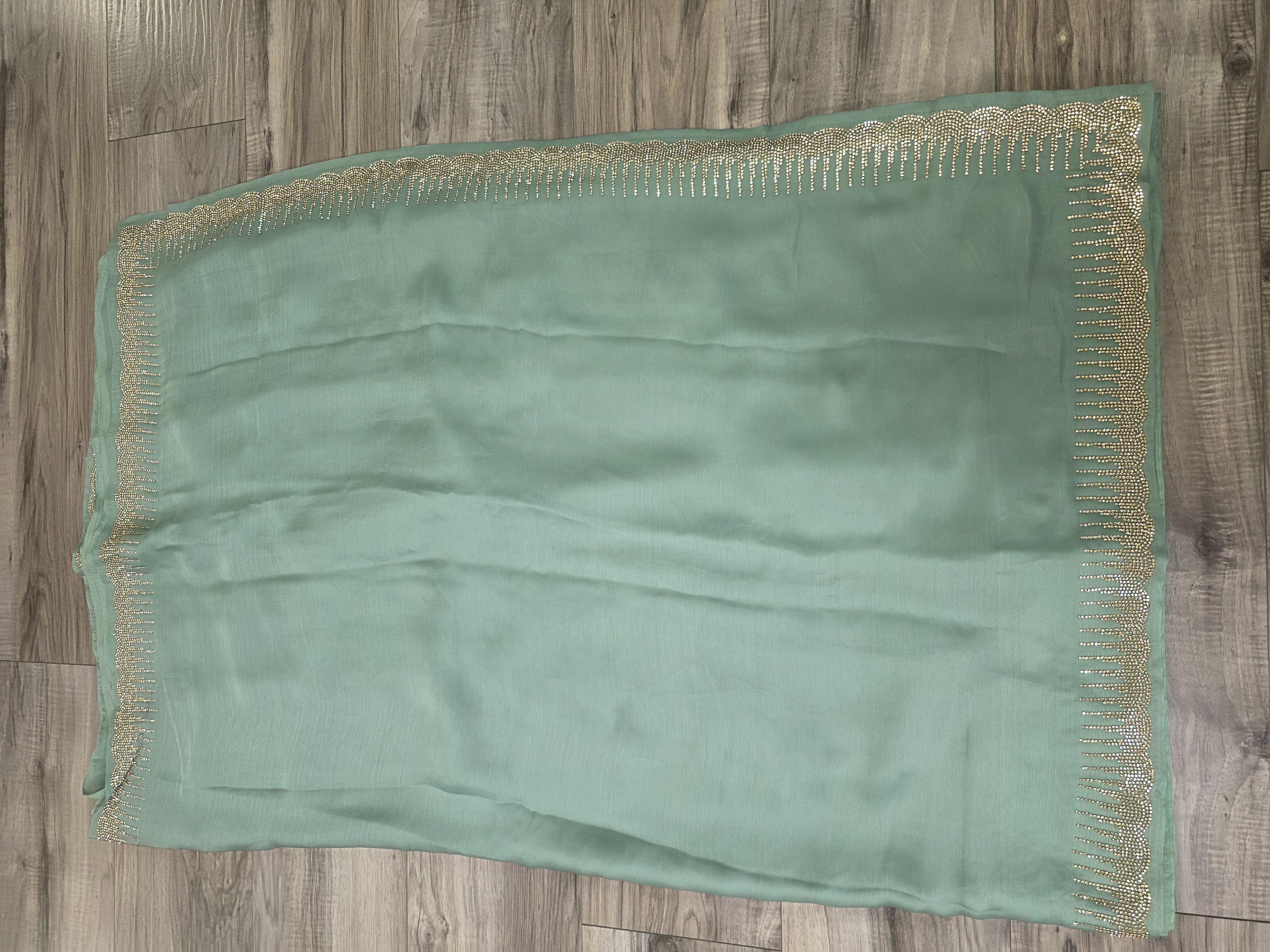 This graceful seafoam green georgette sari features a delicate gold-stone embroidered border and subtle sequin highlights, paired with a matching heavily sequined blouse for a refined, ethereal look.