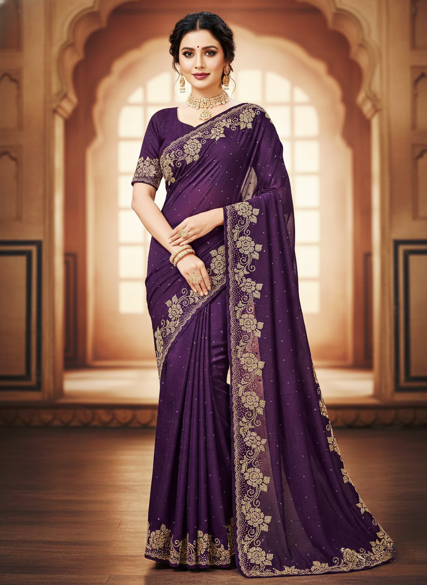 A sophisticated deep eggplant fendi georgette sari featuring intricate gold stonework and floral embroidery along the borders.